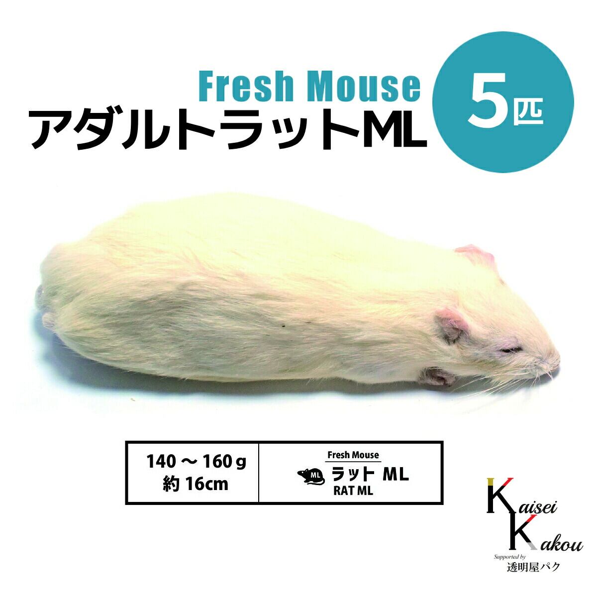 「 アダルトラットML 5匹 Biokimia 」 約16cm 140〜160g 冷凍マウス 冷凍ラット フレッシュマウス フレッシュラット 冷凍餌 安心安全な冷凍マウス。養殖施設は衛生管理を強化し病原菌の侵入を防止。エサの栄養バランスを独自で配合しているので栄養満点です。 【アダルトラットML】・約16cm・140〜160g【徹底的な衛生管理】養殖施設内は陽圧管理を採用。バイオフィルターを通したクリーンな空気を導入し空気は室内から室外へ流れるため外部からの病原菌をシャットアウト。病原菌を持ち込まない為に養殖施設内に入る際はマスク、ガウン、ヘアキャップの着用さらに靴の履き替えを行い手指と靴のアルコールで徹底的に消毒を行っています。【品質のこだわり】エサの栄養バランスを独自で配合しており徹底的な衛生管理により抗生剤、抗菌剤不使用で飼育しています。また飼育機材を定期的にオートクレーブ(高圧蒸気滅菌)し感染対策しています。健康に育ったマウスやラットを安楽死直後に-40℃で瞬間冷凍することにより鮮度をキープ。飼育環境もストレスを軽減し清潔に保てる床材コーンコブを採用。【エサ成分表】栄養成分表:粗タンパク質20、粗繊維9、粗灰分10、カルシウム0.8、総リン0.4、塩化ナトリウム0.4〜1.2、水分13.8、Lリシン1.1原料成分:トウモロコシ、小麦粉、米糠、脱脂大豆、大豆油、魚粉、膨化大豆、Lリシン、メチオニン 、トレオニン、バリン、重炭酸ナトリウム、塩化ナトリウム、リン酸カルシウム、石粉、ビタミン、ミネラル、食物繊維、消化酵素、プロバイオティクス等 5