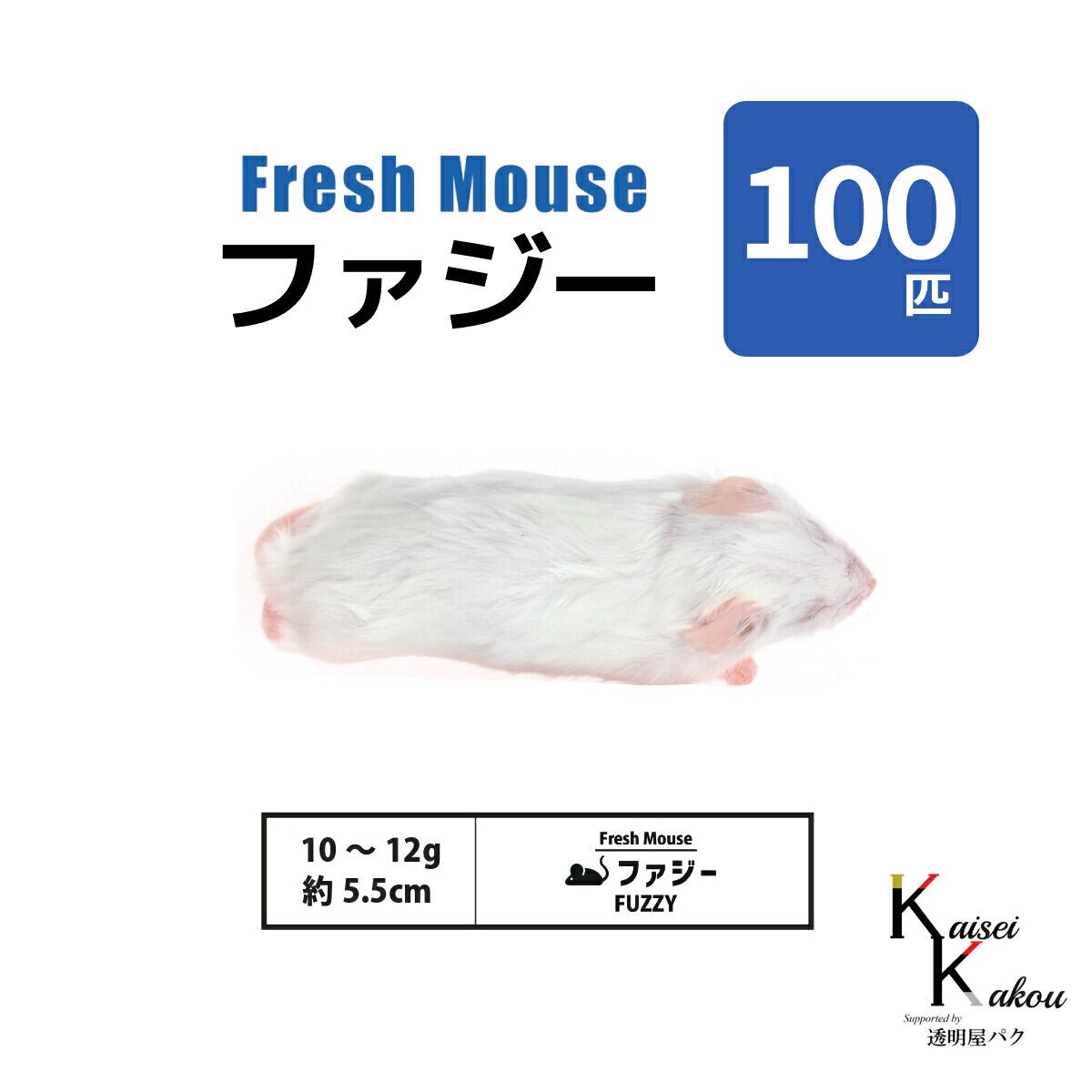「 ファジー 100匹(10袋) Biokimia 」 約5.5cm 10〜12g 冷凍マウス 冷凍ラット フレッシュマウス フレッシュラット 冷凍餌 安心安全な冷凍マウス。養殖施設は衛生管理を強化し病原菌の侵入を防止。エサの栄養バランスを独自で配合しているので栄養満点です。 【ファジー】・約5.5cm・10〜12g【徹底的な衛生管理】養殖施設内は陽圧管理を採用。バイオフィルターを通したクリーンな空気を導入し空気は室内から室外へ流れるため外部からの病原菌をシャットアウト。病原菌を持ち込まない為に養殖施設内に入る際はマスク、ガウン、ヘアキャップの着用さらに靴の履き替えを行い手指と靴のアルコールで徹底的に消毒を行っています。【品質のこだわり】エサの栄養バランスを独自で配合しており徹底的な衛生管理により抗生剤、抗菌剤不使用で飼育しています。また飼育機材を定期的にオートクレーブ(高圧蒸気滅菌)し感染対策しています。健康に育ったマウスやラットを安楽死直後に-40℃で瞬間冷凍することにより鮮度をキープ。飼育環境もストレスを軽減し清潔に保てる床材コーンコブを採用。【エサ成分表】栄養成分表:粗タンパク質?20、粗繊維?9、粗灰分?10、カルシウム?0.8、総リン?0.4、塩化ナトリウム0.4〜1.2、水分?13.8、Lリシン?1.1原料成分:トウモロコシ、小麦粉、米糠、脱脂大豆、大豆油、魚粉、膨化大豆、Lリシン、メチオニン 、トレオニン、バリン、重炭酸ナトリウム、塩化ナトリウム、リン酸カルシウム、石粉、ビタミン、ミネラル、食物繊維、消化酵素、プロバイオティクス等 5