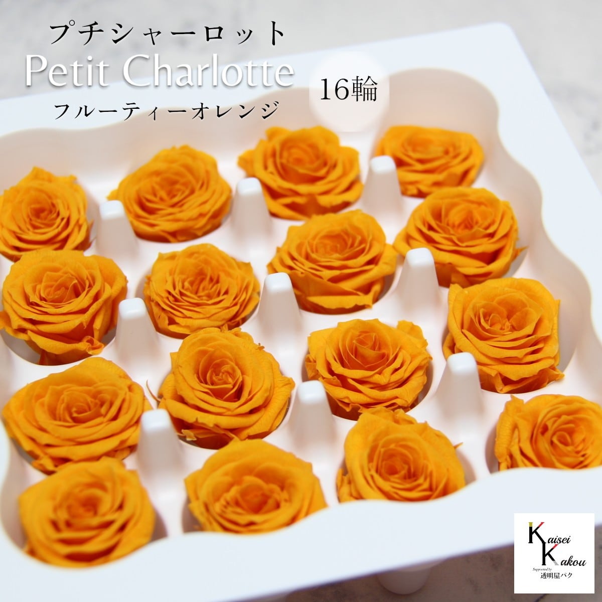 大地農園!プリザーブドフラワー 「プチシャーロット 16輪 フルーティーオレンジ」プリザ 花材 ハーバリウム おしゃれ かわいい プレゼント 贈り物 オオチノウエン 自然からの贈り物。大地農園プリザーブドフラワー! 花径:2.5~3.3cmφ花丈:約2cm小ぶりで可愛らしいプチシャーロット。薔薇の花言葉は「美」「愛」。 誕生日など特別な日のお祝いや、いい夫婦の日など、大切な人に贈り物をする際によく選ばれています。リース、アレンジ、ワックスサシェや髪飾りなどに...便利に使えます。02591-331 クイーンレッド02591-321 レッド02591-211 フランボワーズ02591-181 プリンセスピンク02591-133 バニラピンク02591-001 ピュアホワイト02591-011 アンティックホワイト02591-021 ホワイトシャンパン02591-101 ブライダルピンク02591-102 シャーベットピンク02591-451 スウィートライラック02591-361 ジュリアオレンジ02591-501 モーニングイエロー02591-521 ミモザイエロー02591-351 フルーティーオレンジ02591-521 フレッシュグリーン02591-351 ベビーブルー取扱いの注意プリザーブドフラワーは湿気をとても嫌います。湿度の高い場所では枝や茎の切り口や表面から保存液や染料が染み出すことがあり、衣服などを汚す恐れがあります。ご使用の際には充分ご注意ください。※なるべくふんわりと梱包いたしますが、配送による破損、潰れ、ほころびなどが生じることがございます。ご心配な方は宅配便をご指定下さい。※配送の都合上、商品を箱に直接梱包することもございます。※配送の都合上、使えない根元の部分はカットする場合があります。重量はカット前の重量となります。※高温多湿の場所では染料が切り口や表面からもれることがありますので、ご注意ください。※天然素材を使用している為、商品により色、サイズなど多少の違いが生じる場合がございます。※パッケージデザイン等が予告なく変更される場合もあります。※商品廃番・メーカー欠品など諸事情によりお届けできない場合がございます。※上記内容におけます返品交換は承れませんので、あらかじめご了承ください。 5