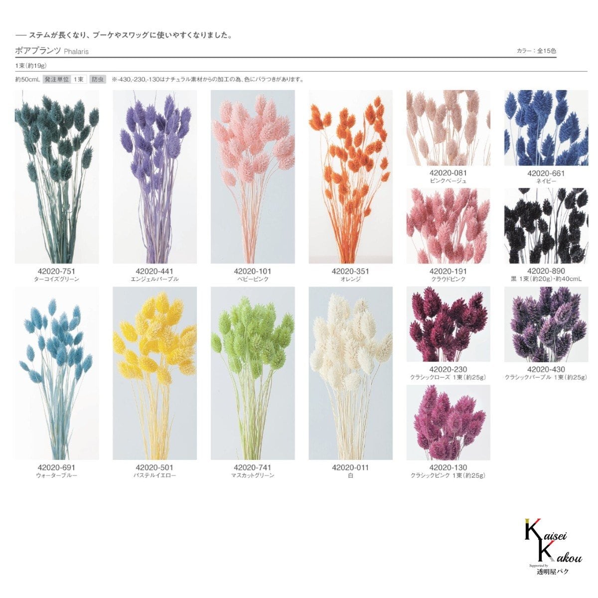 大地農園!プリザーブドフラワー 「ポアプランツ クラッシー (クラシックローズ、黒、白、ネイビー) 半束ずつ4色」プリザ 花材 ハーバリウム おしゃれ かわいい プレゼント 贈り物 オオチノウエン 自然からの贈り物。大地農園プリザーブドフラワー! ギザギザとした猫じゃらしのような美しい花穂を持つ「ポアプランツ」の花言葉は豊かな実り。そのまま花瓶に活けたり、他のドライフラワーと一緒にブーケにまとめて楽しむことが出来ます内容量:2束(半束×4色)取扱いの注意プリザーブドフラワーは湿気をとても嫌います。湿度の高い場所では枝や茎の切り口や表面から保存液や染料が染み出すことがあり、衣服などを汚す恐れがあります。ご使用の際には充分ご注意ください。※なるべくふんわりと梱包いたしますが、配送による破損、潰れ、ほころびなどが生じることがございます。ご心配な方は宅配便をご指定下さい。※配送の都合上、商品を箱に直接梱包することもございます。※高温多湿の場所では染料が切り口や表面からもれることがありますので、ご注意ください。※天然素材を使用している為、商品により色、サイズなど多少の違いが生じる場合がございます。※パッケージデザイン等が予告なく変更される場合もあります。※商品廃番・メーカー欠品など諸事情によりお届けできない場合がございます。※上記内容におけます返品交換は承れませんので、あらかじめご了承ください。 5