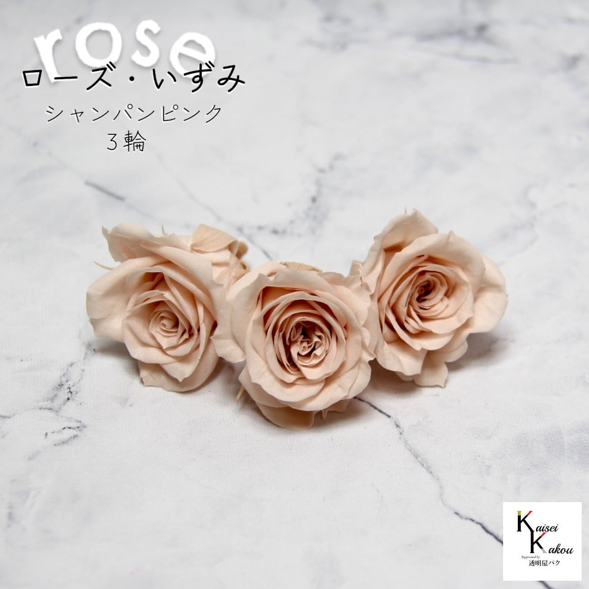 大地農園!プリザーブドフラワー 「ローズいずみ 3輪 シャンパンピンク」プリザ 花材 ハーバリウム おしゃれ かわいい プレゼント 贈り物 オオチノウエン バラ 薔薇 ローズ rose 自然からの贈り物。大地農園プリザーブドフラワー! 花径:3.5~4.5cmφ花丈:約3~3.5cm使いやすいオーソドックスな花形で人気No.1のローズです。メインの花材としても、添花としても使える程よいサイズで手頃な価格も魅力です。「お部屋にお花を飾りたいけど生花は管理が大変そう・・・」という方や「インテリアとしてお花を取り入れたい」という方に。大切な人に贈り物をする際にもよく選ばれています。リース、アレンジ、ワックスサシェや髪飾りなどに...便利に使えます。取扱いの注意プリザーブドフラワーは湿気をとても嫌います。湿度の高い場所では枝や茎の切り口や表面から保存液や染料が染み出すことがあり、衣服などを汚す恐れがあります。ご使用の際には充分ご注意ください。※なるべくふんわりと梱包いたしますが、配送による破損、潰れ、ほころびなどが生じることがございます。ご心配な方は宅配便をご指定下さい。※配送の都合上、商品を箱に直接梱包することもございます。※配送の都合上、使えない根元の部分はカットする場合があります。重量はカット前の重量となります。※高温多湿の場所では染料が切り口や表面からもれることがありますので、ご注意ください。※天然素材を使用している為、商品により色、サイズなど多少の違いが生じる場合がございます。※パッケージデザイン等が予告なく変更される場合もあります。※商品廃番・メーカー欠品など諸事情によりお届けできない場合がございます。※上記内容におけます返品交換は承れませんので、あらかじめご了承ください。 5