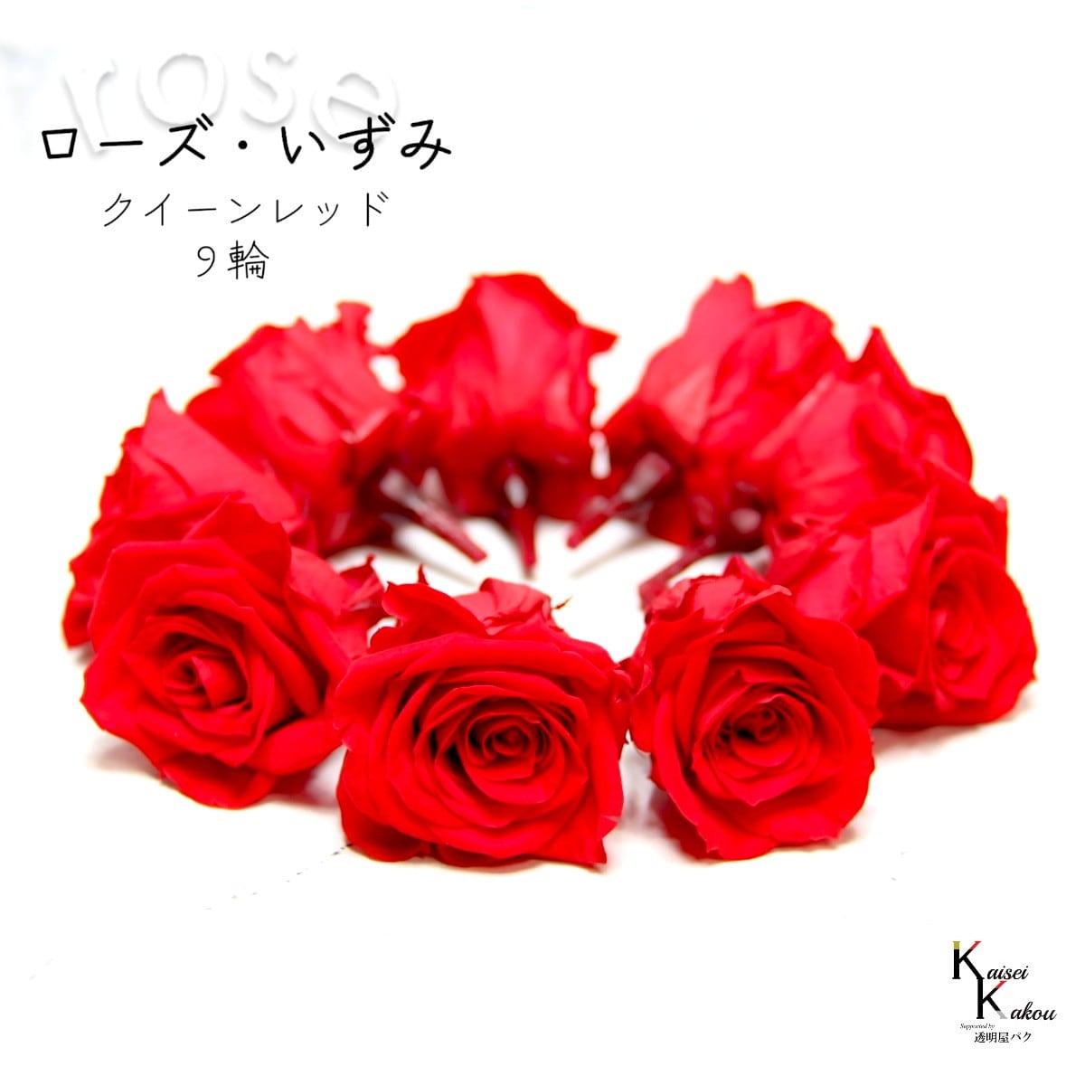 大地農園!プリザーブドフラワー 「ローズいずみ 9輪 クイーンレッド」プリザ 花材 ハーバリウム おしゃれ かわいい プレゼント 贈り物 オオチノウエン バラ 薔薇 ローズ rose 自然からの贈り物。大地農園プリザーブドフラワー! 花径:3.5~4.5cmφ花丈:約3~3.5cm使いやすいオーソドックスな花形で人気No.1のローズです。メインの花材としても、添花としても使える程よいサイズで手頃な価格も魅力です。「お部屋にお花を飾りたいけど生花は管理が大変そう・・・」という方や「インテリアとしてお花を取り入れたい」という方に。大切な人に贈り物をする際にもよく選ばれています。リース、アレンジ、ワックスサシェや髪飾りなどに...便利に使えます。取扱いの注意プリザーブドフラワーは湿気をとても嫌います。湿度の高い場所では枝や茎の切り口や表面から保存液や染料が染み出すことがあり、衣服などを汚す恐れがあります。ご使用の際には充分ご注意ください。※なるべくふんわりと梱包いたしますが、配送による破損、潰れ、ほころびなどが生じることがございます。ご心配な方は宅配便をご指定下さい。※配送の都合上、商品を箱に直接梱包することもございます。※配送の都合上、使えない根元の部分はカットする場合があります。重量はカット前の重量となります。※高温多湿の場所では染料が切り口や表面からもれることがありますので、ご注意ください。※天然素材を使用している為、商品により色、サイズなど多少の違いが生じる場合がございます。※パッケージデザイン等が予告なく変更される場合もあります。※商品廃番・メーカー欠品など諸事情によりお届けできない場合がございます。※上記内容におけます返品交換は承れませんので、あらかじめご了承ください。 5