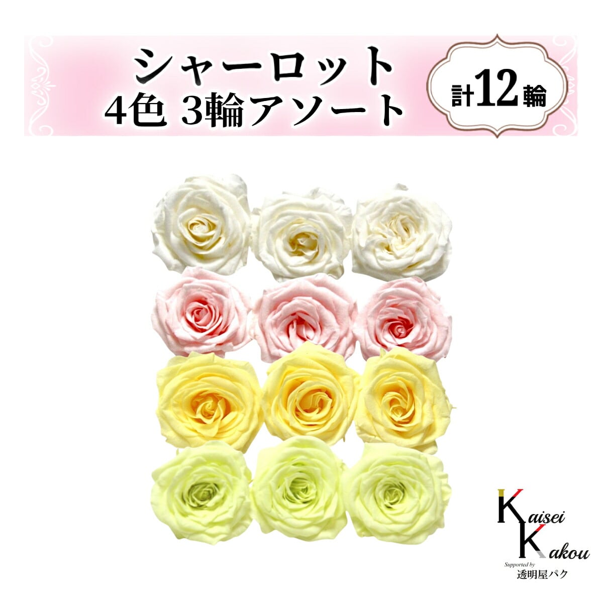 大地農園!プリザーブドフラワー「シャーロット 4色×3輪アソート 計12輪」「アンティックホワイト ブライダルピンク モーニングイエロー フレッシュグリーン」プリザ 花材 ハーバリウム おしゃれ ピンク バラ かわいい プレゼント 贈り物 オオチノウエン