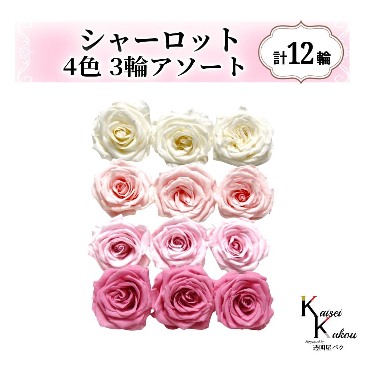 大地農園!プリザーブドフラワー「シャーロット 4色×3輪アソート 計12輪」「アンティックホワイト ブライダルピンク シャーベットピンク プリンセスピンク」プリザ 花材 ハーバリウム おしゃれ ピンク バラ かわいい プレゼント 贈り物 オオチノウエン