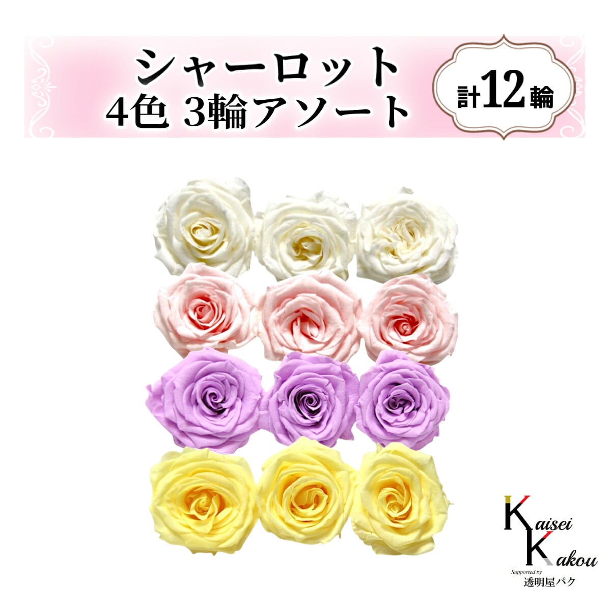 大地農園!プリザーブドフラワー「シャーロット 4色×3輪アソート 計12輪」「アンティックホワイト ブライダルピンク スウィートライラック モーニングイエロー」プリザ 花材 ハーバリウム おしゃれ ピンク バラ かわいい プレゼント 贈り物 オオチノウエン