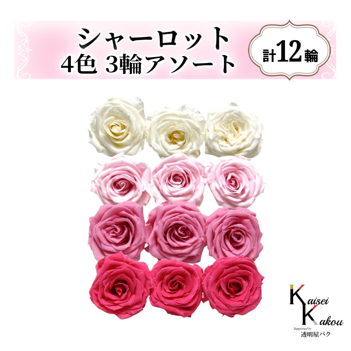 大地農園!プリザーブドフラワー「シャーロット 4色×3輪アソート 計12輪」「アンティックホワイト シャーベットピンク プリンセスピンク フランボワーズ」プリザ 花材 ハーバリウム おしゃれ ピンク バラ かわいい プレゼント 贈り物 オオチノウエン