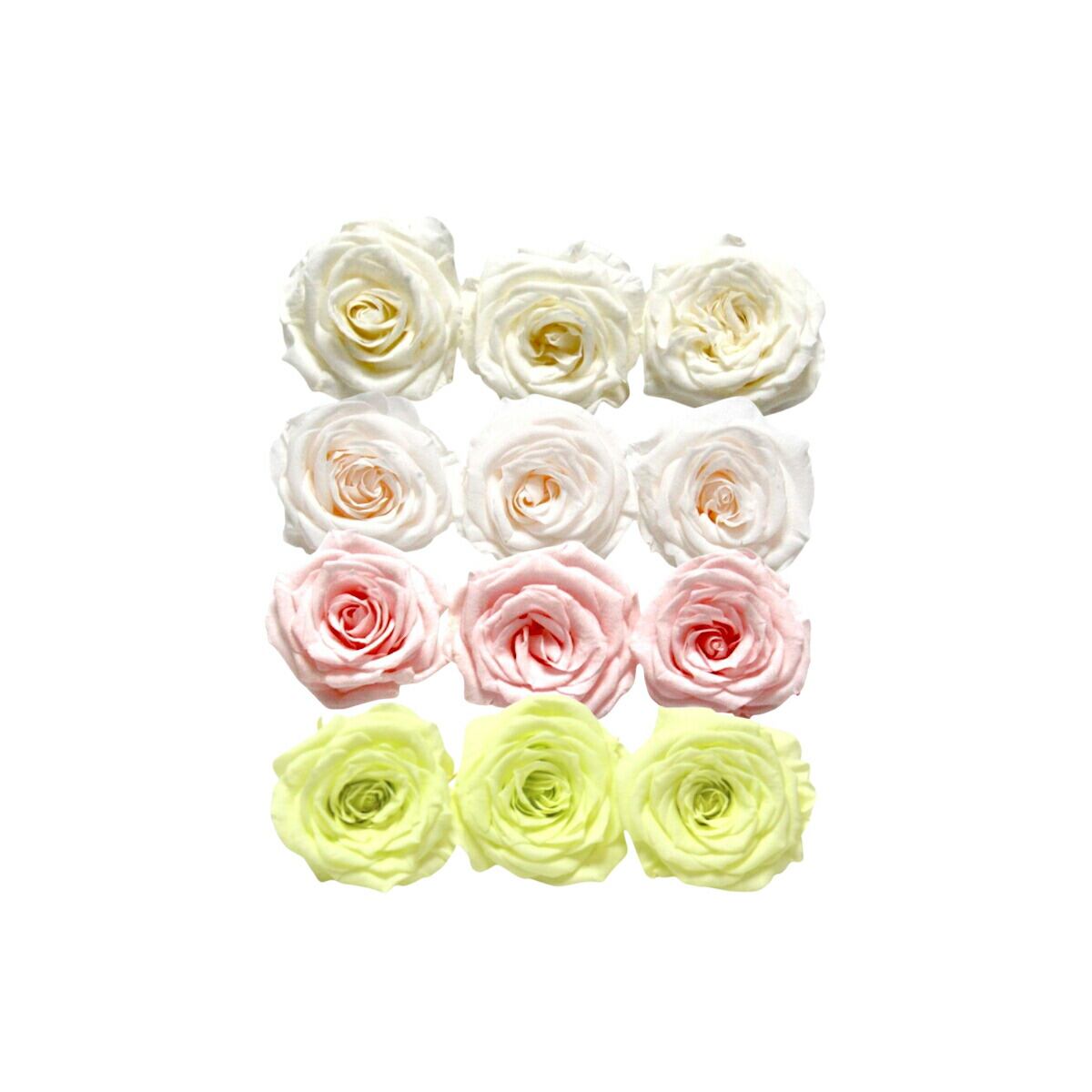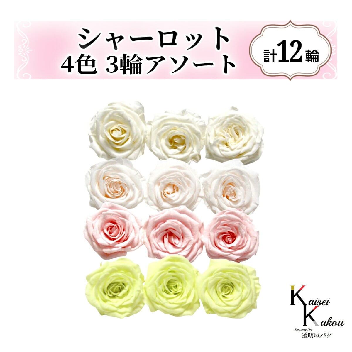 大地農園!プリザーブドフラワー「シャーロット 4色×3輪アソート 計12輪」「アンティックホワイト ホワイトシャンパン ブライダルピンク フレッシュグリーン」プリザ 花材 ハーバリウム おしゃれ ピンク バラ かわいい プレゼント 贈り物 オオチノウエン