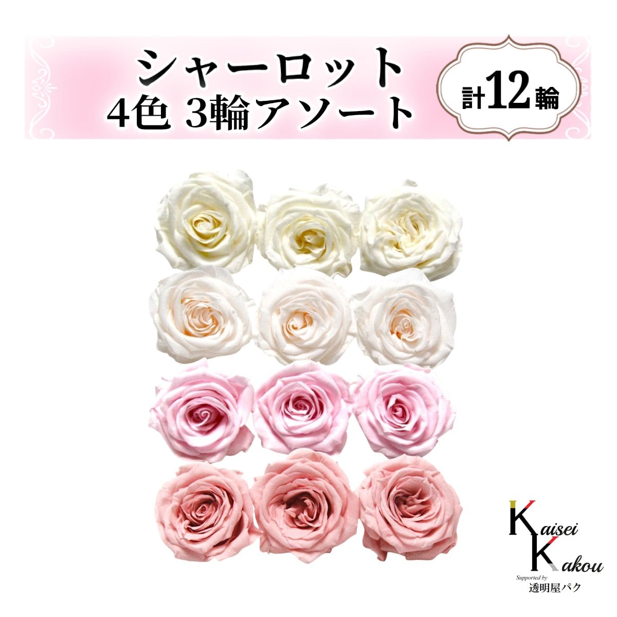 大地農園!プリザーブドフラワー「シャーロット 4色×3輪アソート 計12輪」「アンティックホワイト ホワイトシャンパン シャーベットピンク バニラピンク」プリザ 花材 ハーバリウム おしゃれ ピンク バラ かわいい プレゼント 贈り物 オオチノウエン