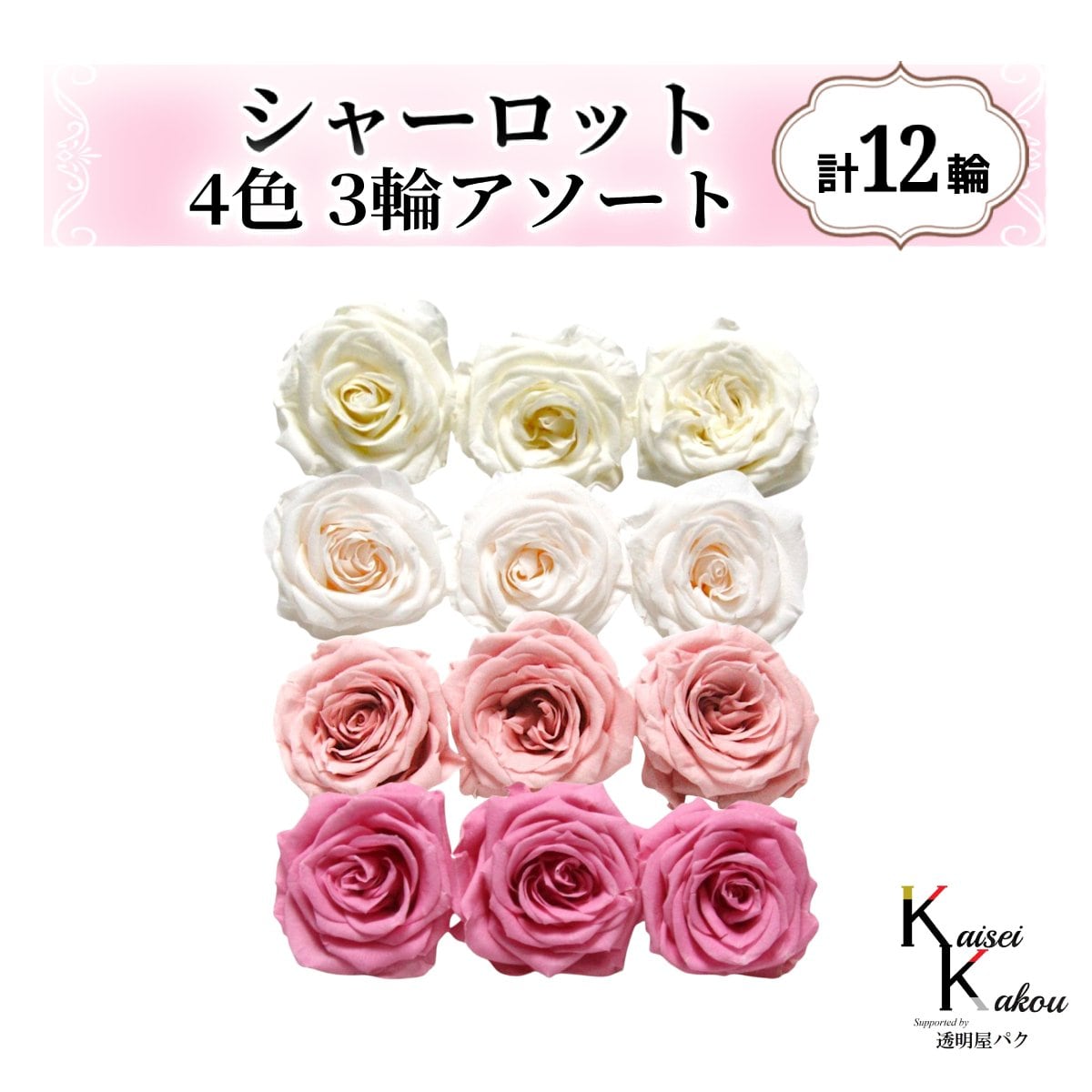 大地農園!プリザーブドフラワー「シャーロット 4色×3輪アソート 計12輪」「アンティックホワイト ホワイトシャンパン バニラピンク プリンセスピンク」プリザ 花材 ハーバリウム おしゃれ ピンク バラ かわいい プレゼント 贈り物 オオチノウエン
