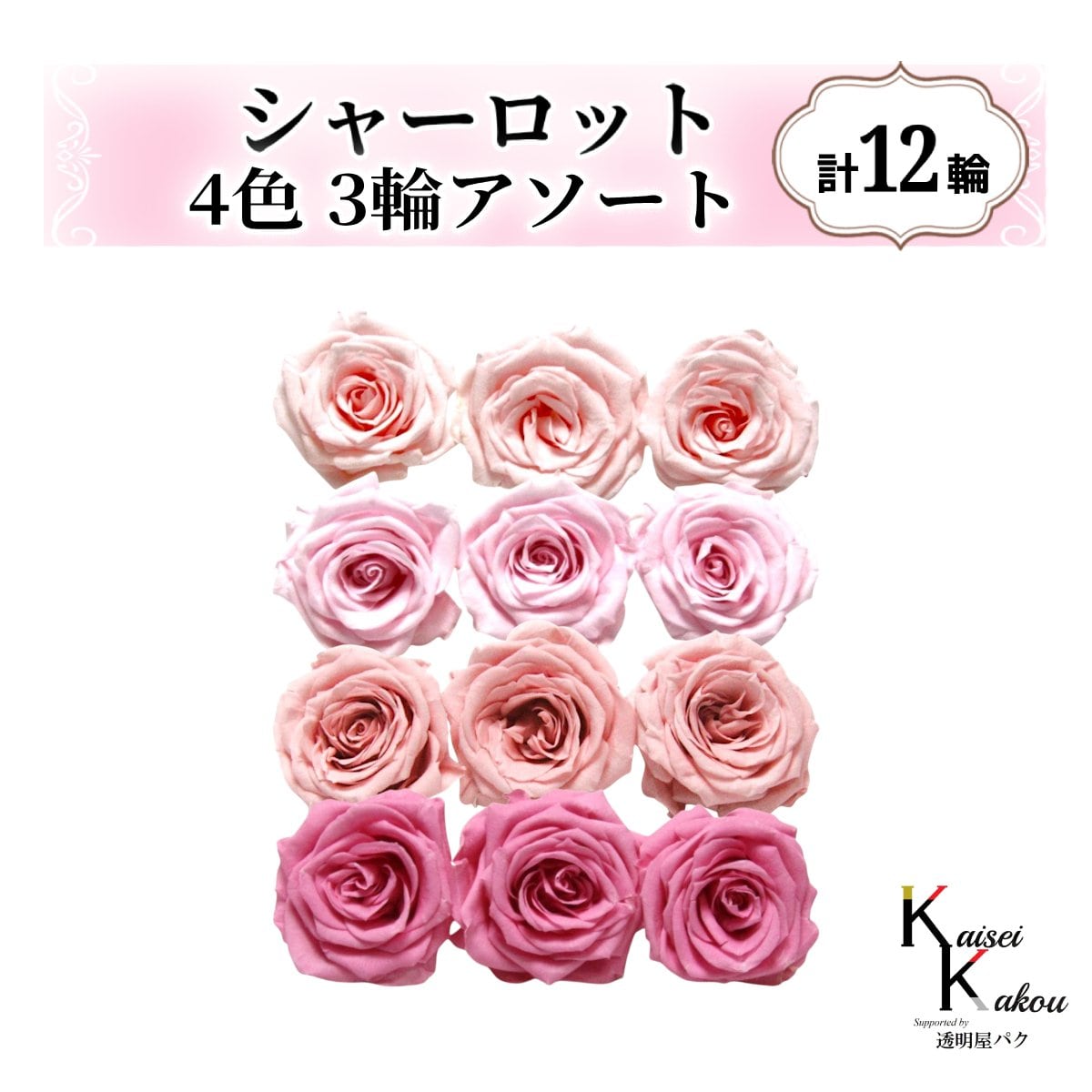 大地農園!プリザーブドフラワー「シャーロット 4色×3輪アソート 計12輪」「ブライダルピンク シャーベットピンク バニラピンク プリンセスピンク」プリザ 花材 ハーバリウム おしゃれ ピンク バラ かわいい プレゼント 贈り物 オオチノウエン