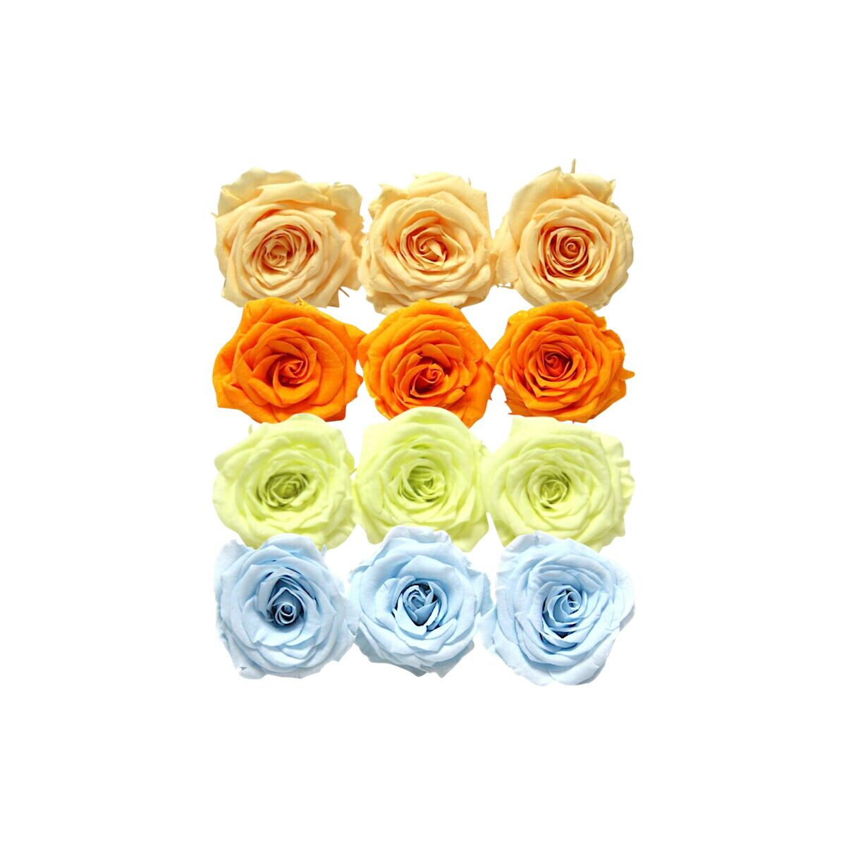大地農園!プリザーブドフラワー「シャーロット 4色×3輪アソート 計12輪」「ジュリアオレンジ フルーティオレンジ フレッシュグリーン ベビーブルー」プリザ 花材 ハーバリウム おしゃれ ピンク バラ かわいい プレゼント 贈り物 オオチノウエン