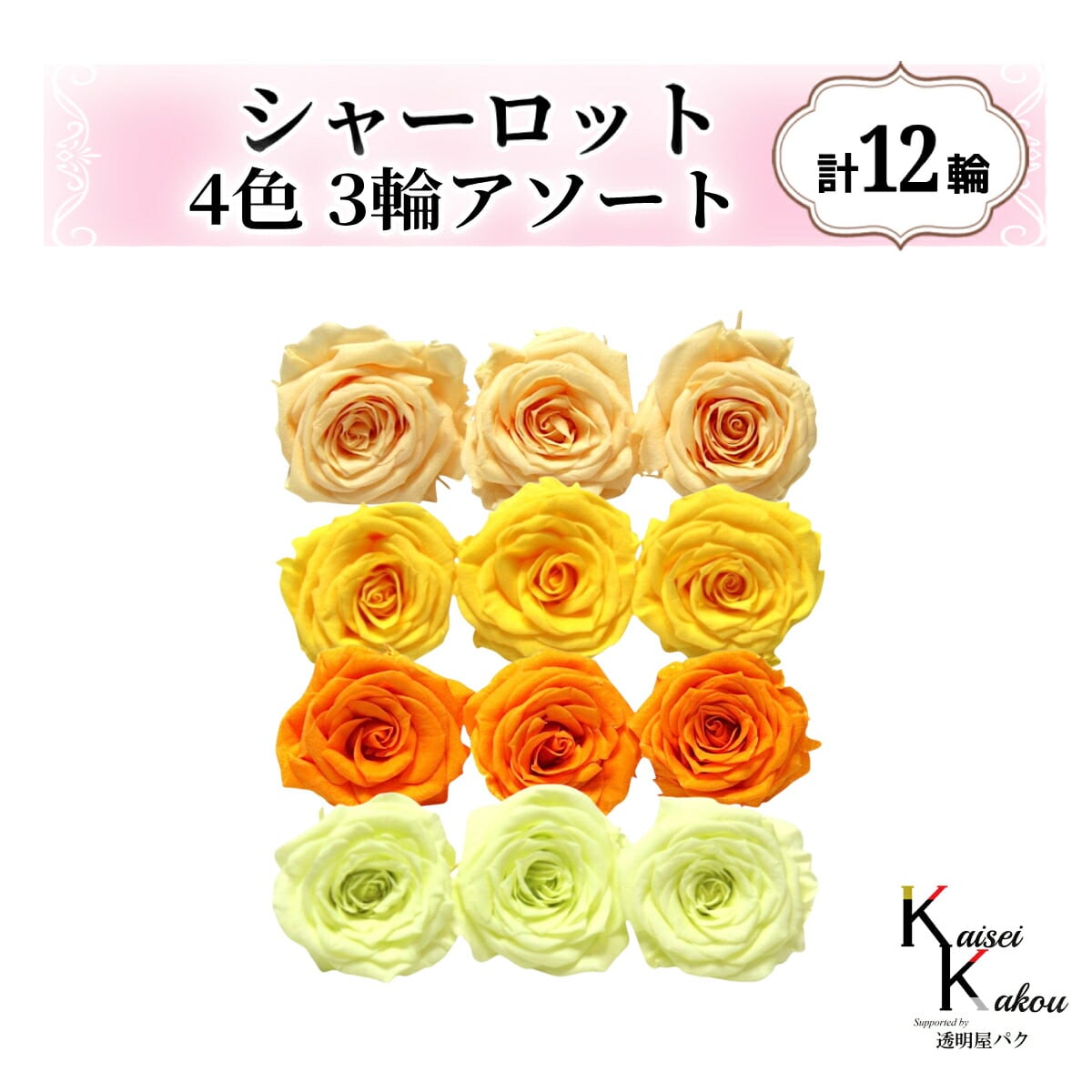 大地農園!プリザーブドフラワー「シャーロット 4色×3輪アソート 計12輪」「ジュリアオレンジ ミモザイエロー フルーティオレンジ フレッシュグリーン」プリザ 花材 ハーバリウム おしゃれ ピンク バラ かわいい プレゼント 贈り物 オオチノウエン