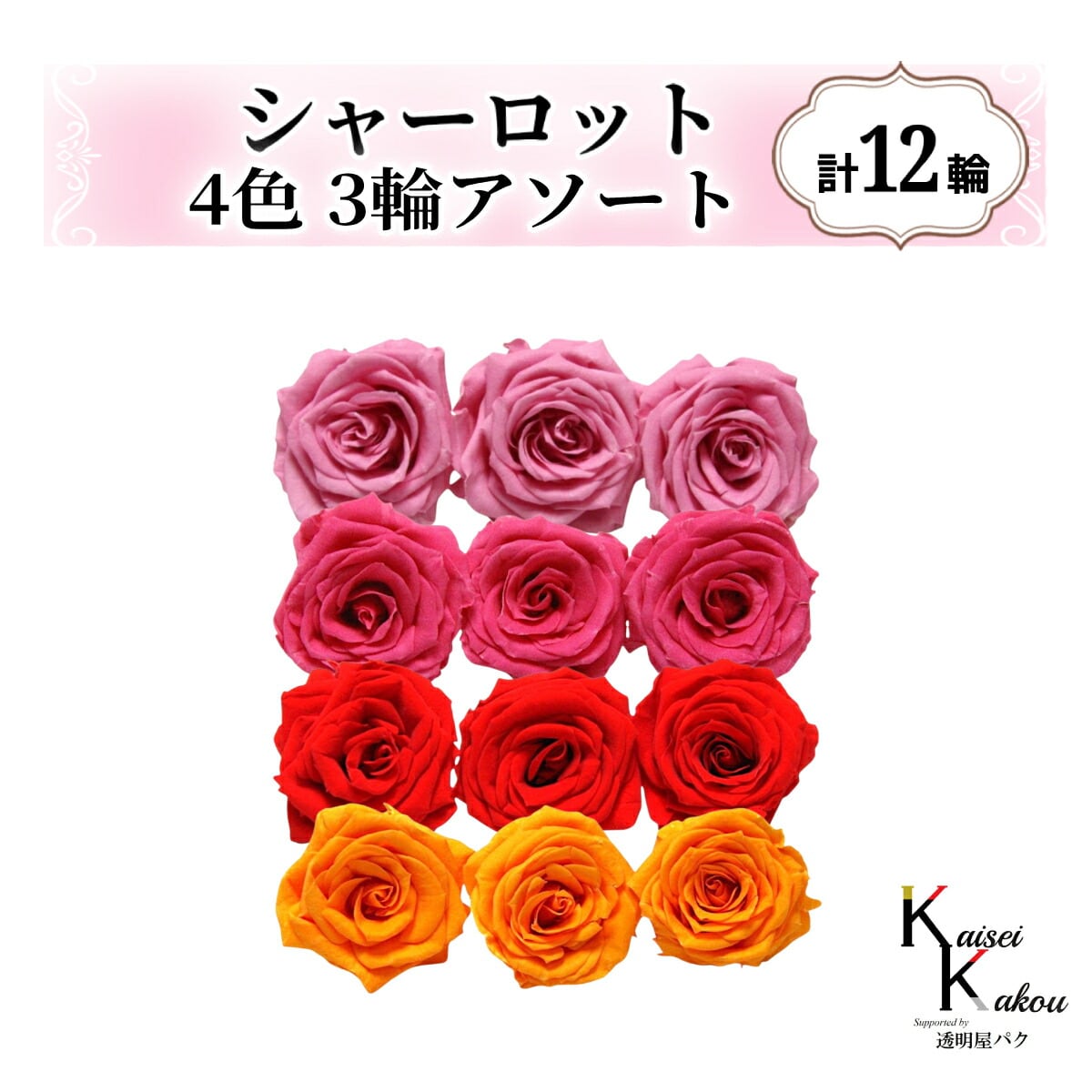 大地農園!プリザーブドフラワー「シャーロット 4色×3輪アソート 計12輪」「プリンセスピンク フランボワーズ レッド フルーティオレンジ」プリザ 花材 ハーバリウム おしゃれ ピンク バラ かわいい プレゼント 贈り物 オオチノウエン