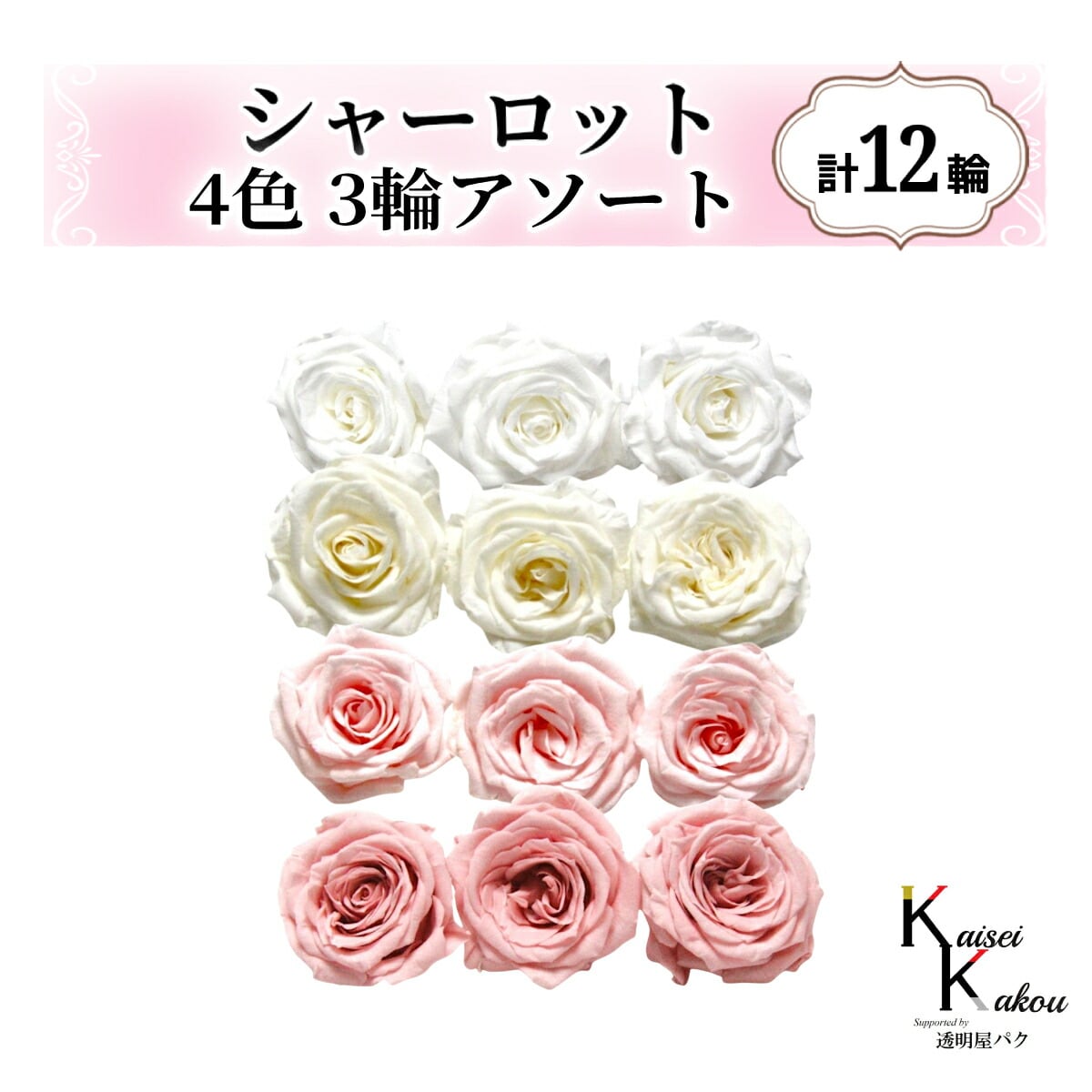 大地農園!プリザーブドフラワー「シャーロット 4色×3輪アソート 計12輪」「ピュアホワイト アンティックホワイト ブライダルピンク バニラピンク」プリザ 花材 ハーバリウム おしゃれ ピンク バラ かわいい プレゼント 贈り物 オオチノウエン
