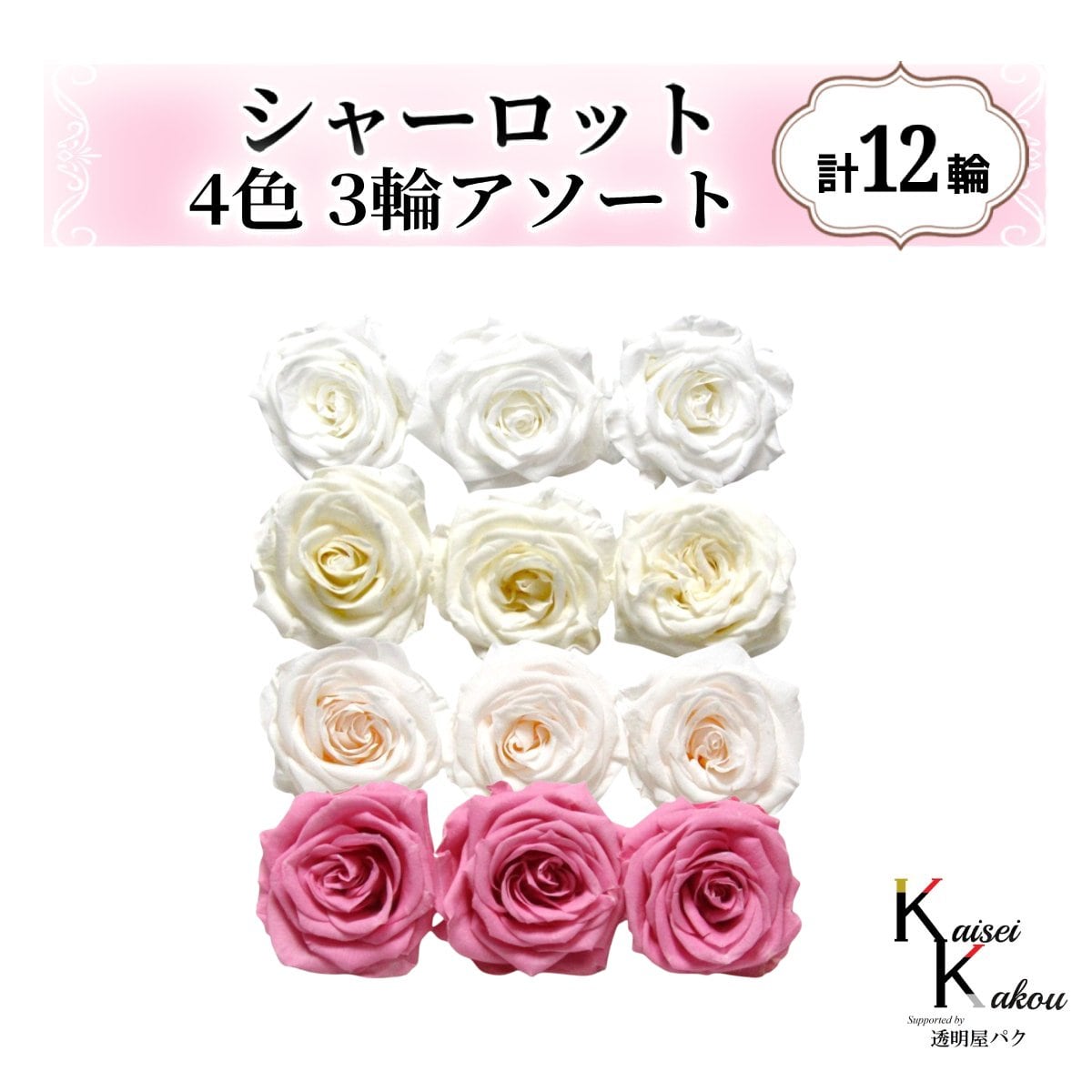 大地農園!プリザーブドフラワー「シャーロット 4色×3輪アソート 計12輪」「ピュアホワイト アンティックホワイト ホワイトシャンパン プリンセスピンク」プリザ 花材 ハーバリウム おしゃれ ピンク バラ かわいい プレゼント 贈り物 オオチノウエン