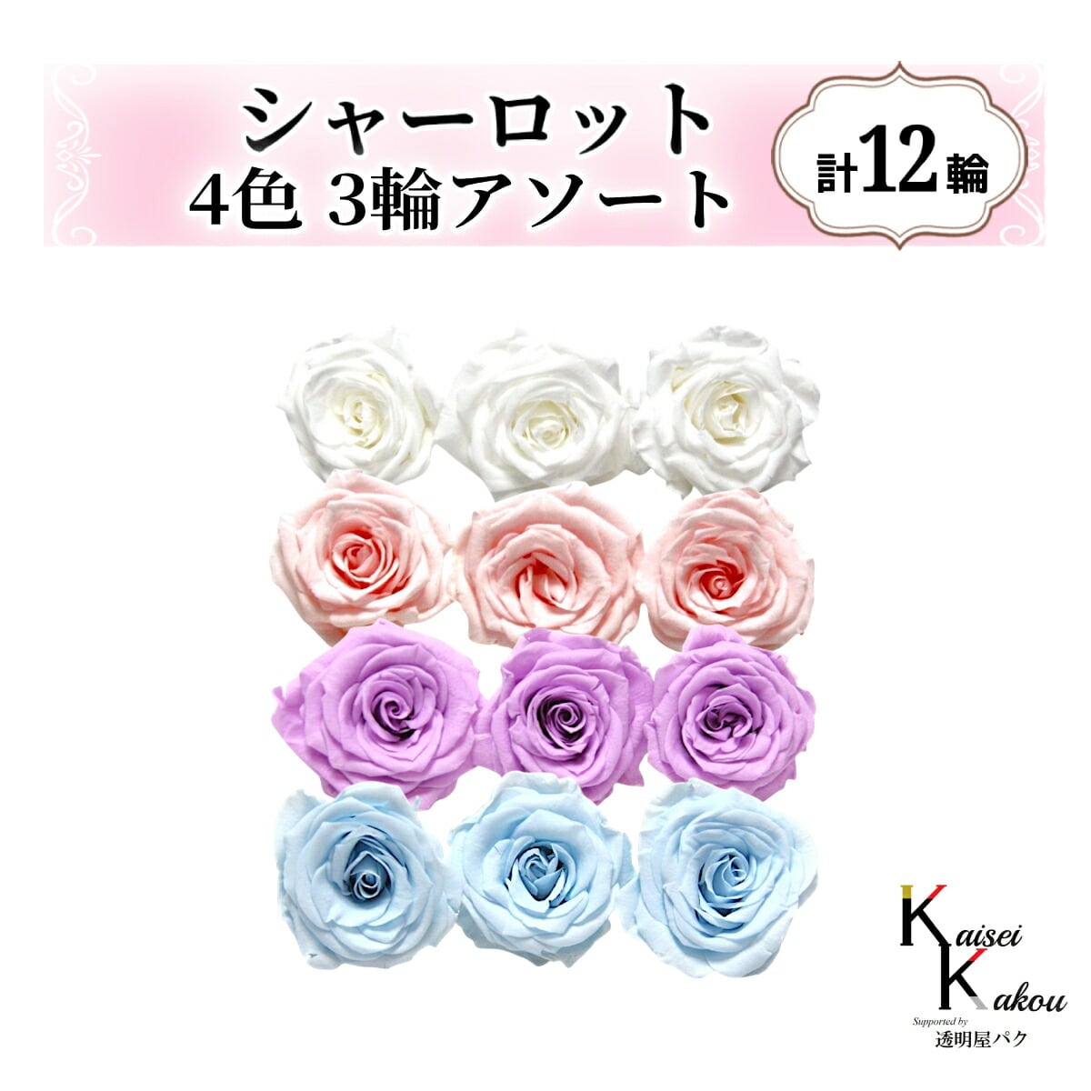 大地農園!プリザーブドフラワー「シャーロット 4色×3輪アソート 計12輪」「ピュアホワイト ブライダルピンク スウィートライラック ベビーブルー」プリザ 花材 ハーバリウム おしゃれ ピンク バラ かわいい プレゼント 贈り物 オオチノウエン