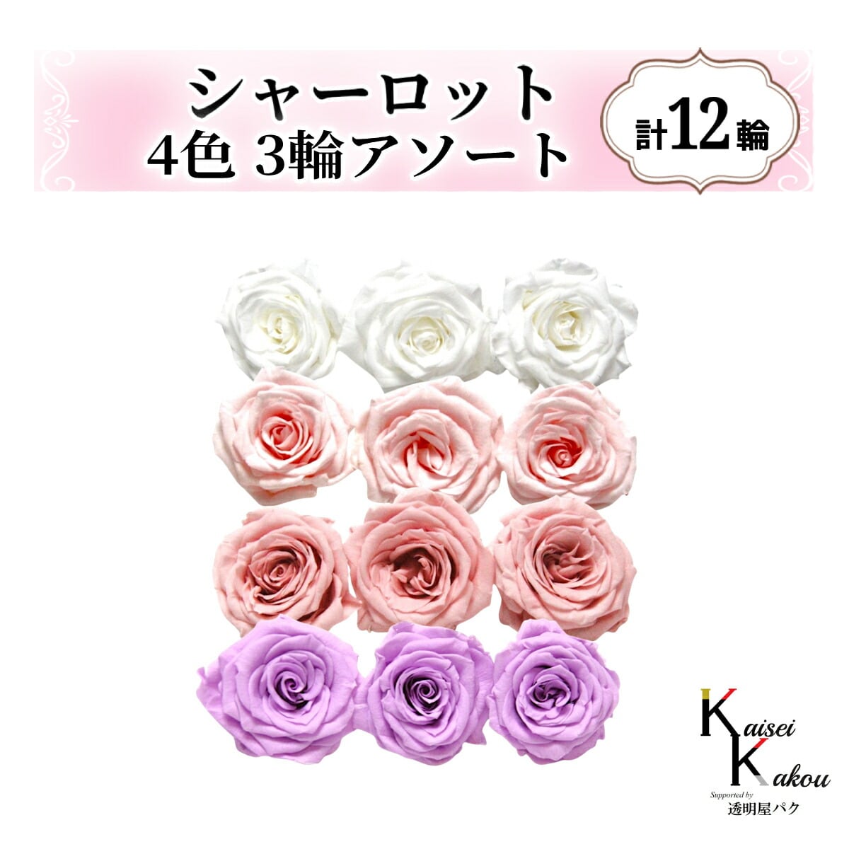 大地農園!プリザーブドフラワー「シャーロット 4色×3輪アソート 計12輪」「ピュアホワイト ブライダルピンク バニラピンク スウィートライラック」プリザ 花材 ハーバリウム おしゃれ ピンク バラ かわいい プレゼント 贈り物 オオチノウエン