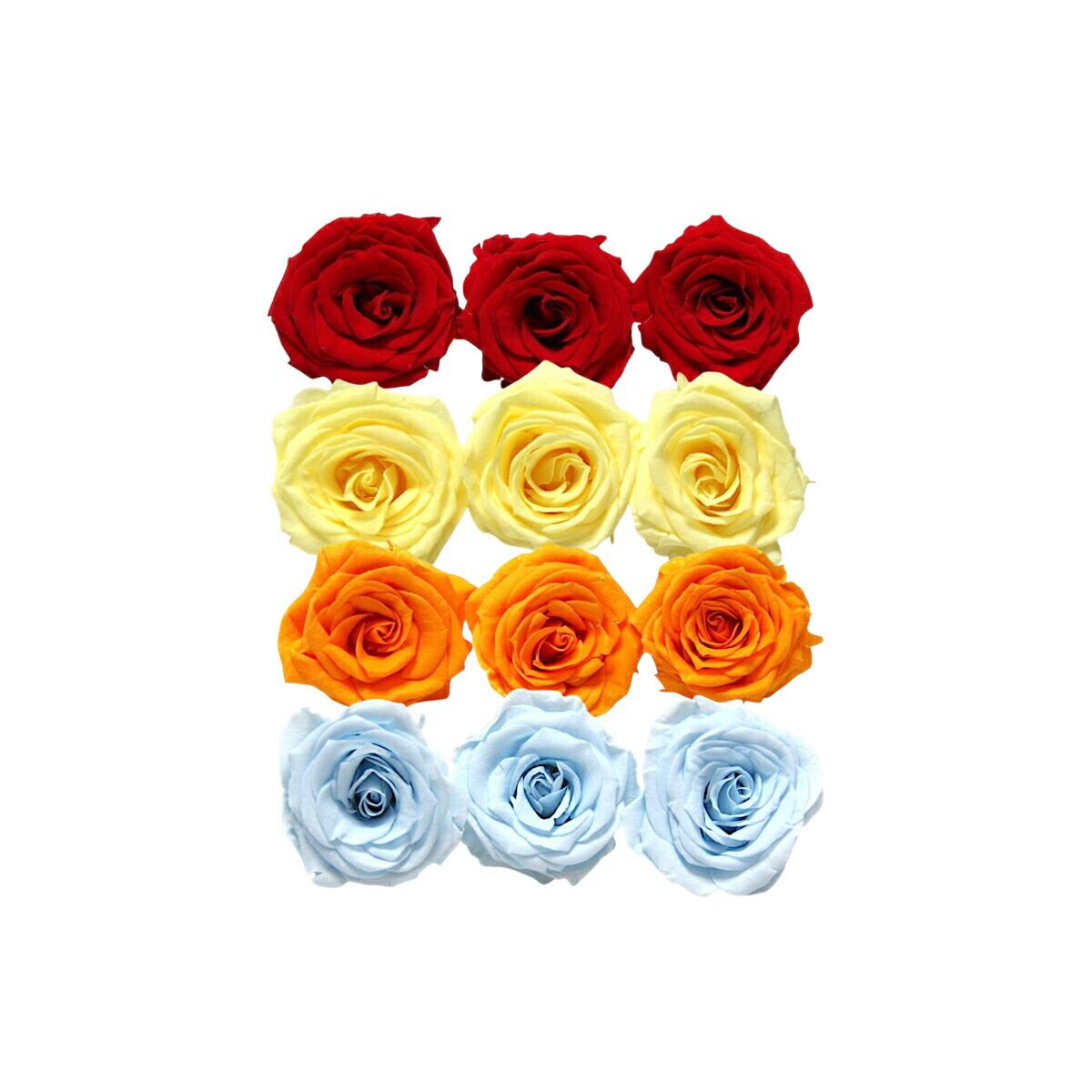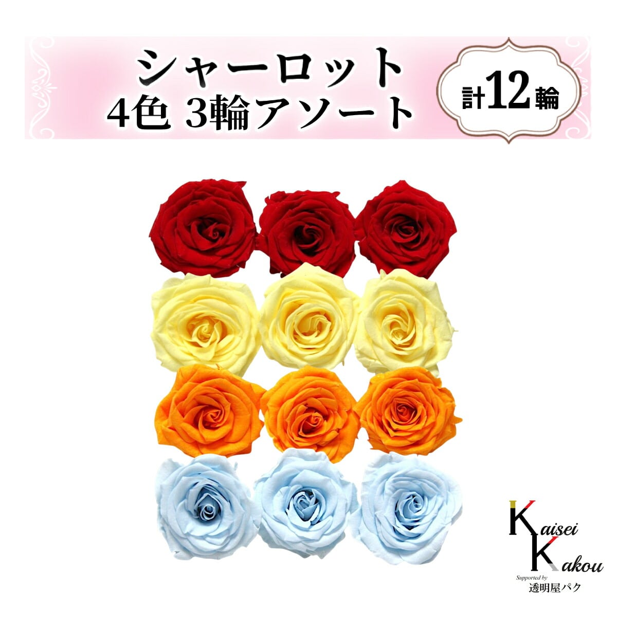 大地農園!プリザーブドフラワー「シャーロット 4色×3輪アソート 計12輪」「クイーンレッド モーニングイエロー フルーティオレンジ ベビーブルー」プリザ 花材 ハーバリウム おしゃれ ピンク バラ かわいい プレゼント 贈り物 オオチノウエン