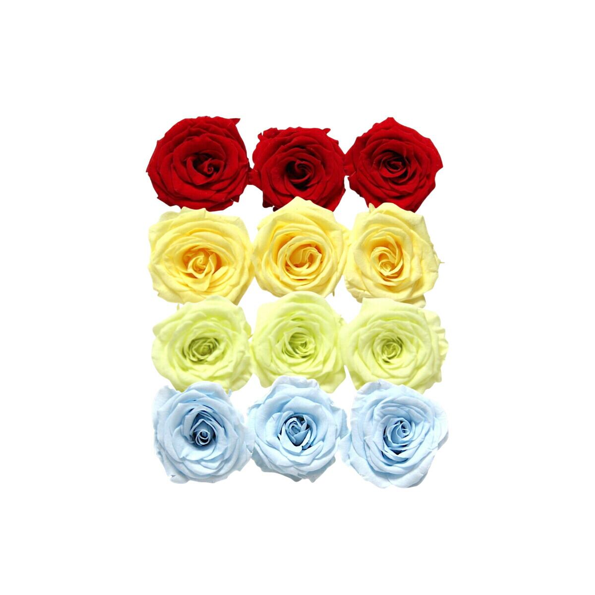 大地農園!プリザーブドフラワー「シャーロット 4色×3輪アソート 計12輪」「クイーンレッド モーニングイエロー フレッシュグリーン ベビーブルー」プリザ 花材 ハーバリウム おしゃれ ピンク バラ かわいい プレゼント 贈り物 オオチノウエン