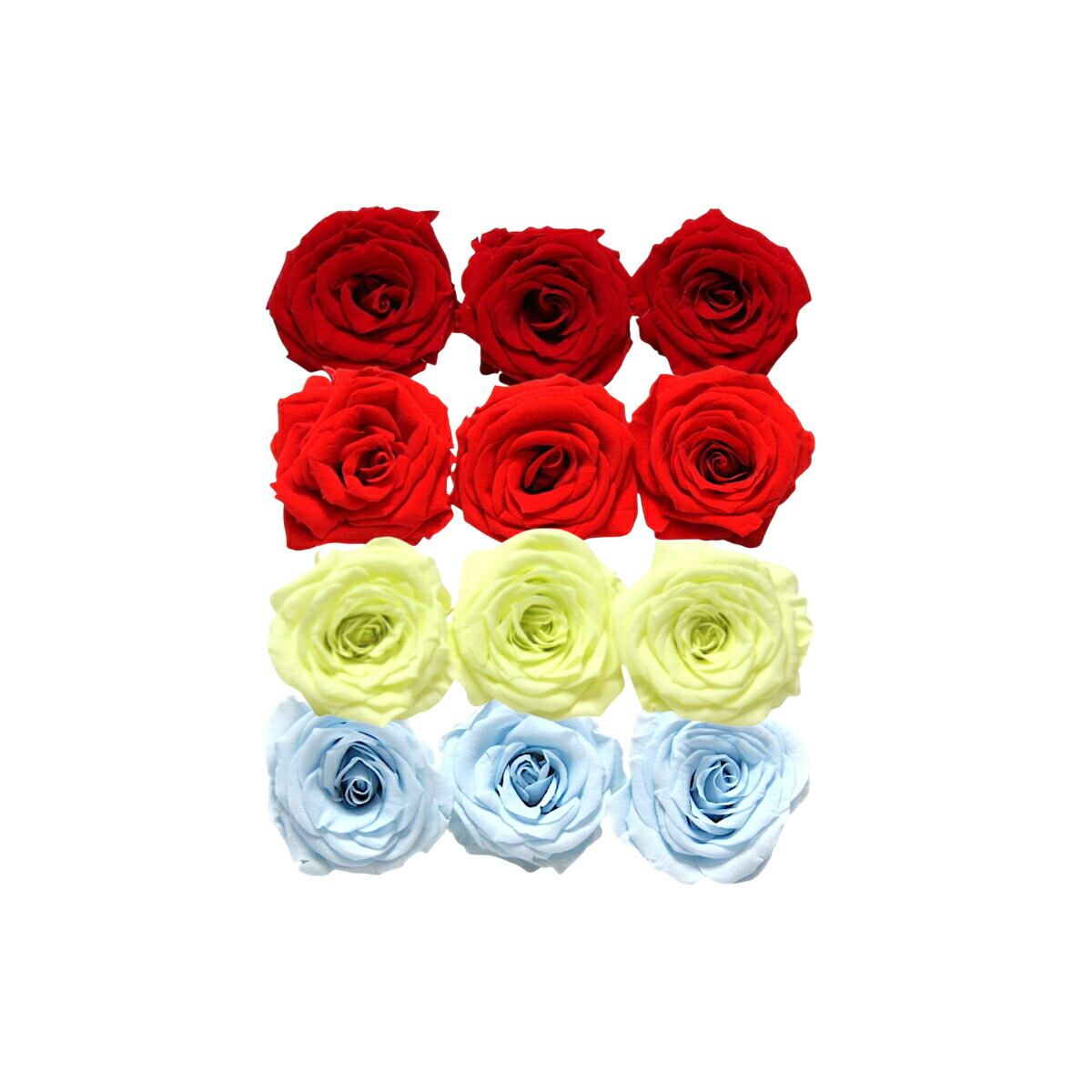大地農園!プリザーブドフラワー「シャーロット 4色×3輪アソート 計12輪」「クイーンレッド レッド フレッシュグリーン ベビーブルー」プリザ 花材 ハーバリウム おしゃれ ピンク バラ かわいい プレゼント 贈り物 オオチノウエン