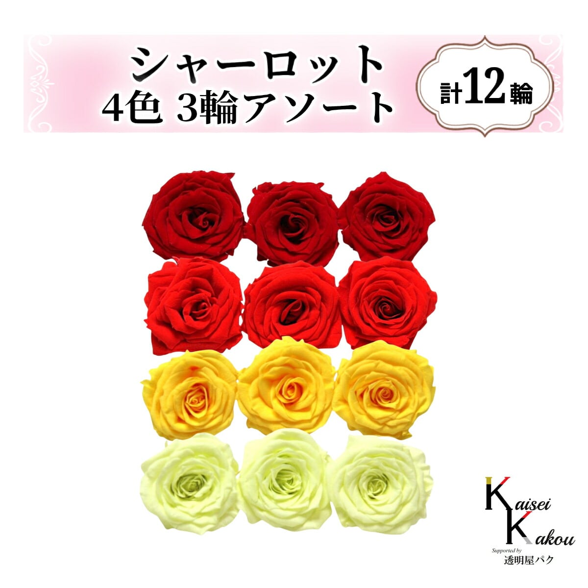 大地農園!プリザーブドフラワー「シャーロット 4色×3輪アソート 計12輪」「クイーンレッド レッド ミモザイエロー フレッシュグリーン」プリザ 花材 ハーバリウム おしゃれ ピンク バラ かわいい プレゼント 贈り物 オオチノウエン