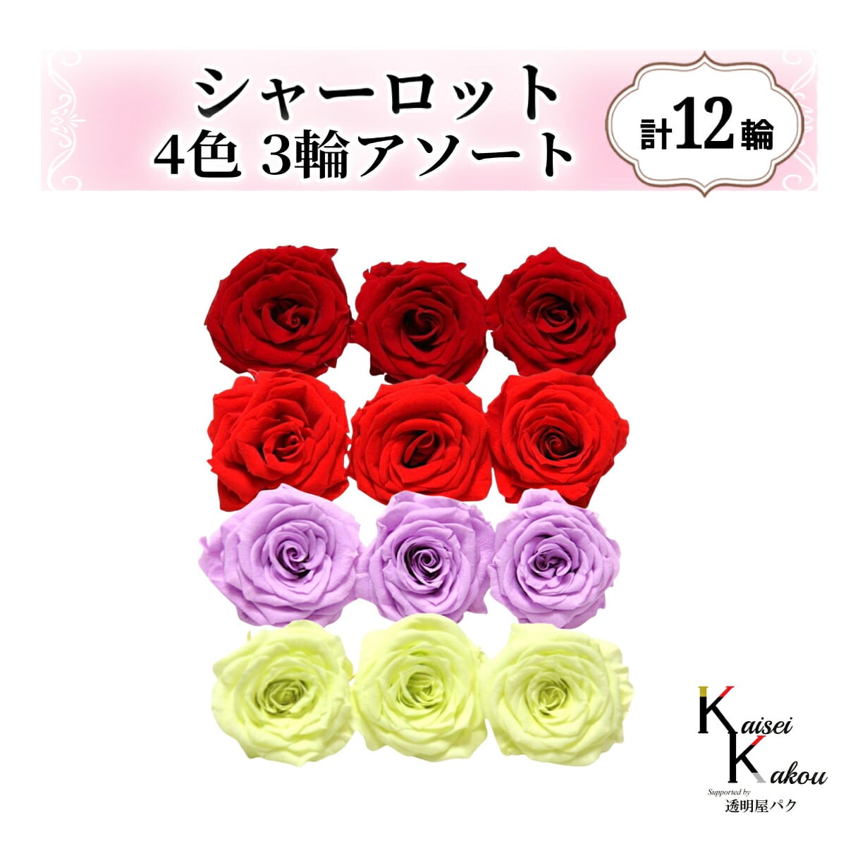 大地農園!プリザーブドフラワー「シャーロット 4色×3輪アソート 計12輪」「クイーンレッド レッド スウィートライラック フレッシュグリーン」プリザ 花材 ハーバリウム おしゃれ ピンク バラ かわいい プレゼント 贈り物 オオチノウエン