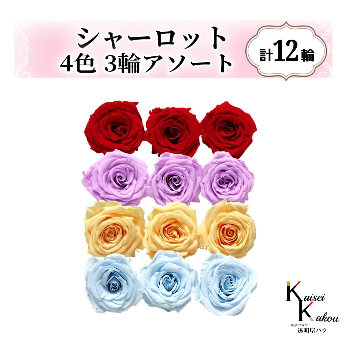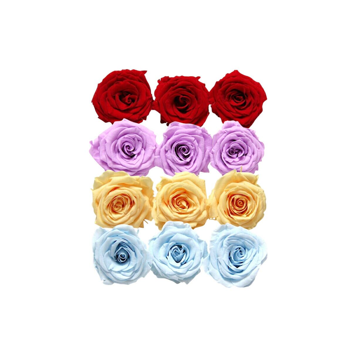 大地農園!プリザーブドフラワー「シャーロット 4色×3輪アソート 計12輪」「クイーンレッド スウィートライラック ジュリアオレンジ ベビーブルー」プリザ 花材 ハーバリウム おしゃれ ピンク バラ かわいい プレゼント 贈り物 オオチノウエン