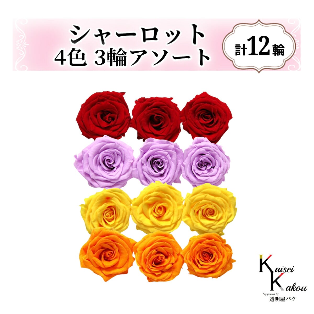 大地農園!プリザーブドフラワー「シャーロット 4色×3輪アソート 計12輪」「クイーンレッド スウィートライラック ミモザイエロー フルーティオレンジ」プリザ 花材 ハーバリウム おしゃれ ピンク バラ かわいい プレゼント 贈り物 オオチノウエン