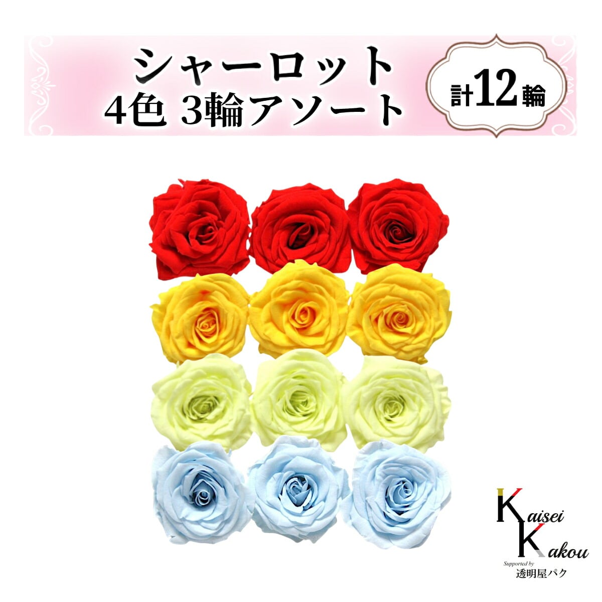 大地農園!プリザーブドフラワー「シャーロット 4色×3輪アソート 計12輪」「レッド ミモザイエロー フレッシュグリーン ベビーブルー」プリザ 花材 ハーバリウム おしゃれ ピンク バラ かわいい プレゼント 贈り物 オオチノウエン