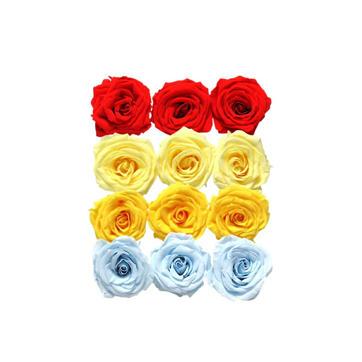 大地農園!プリザーブドフラワー「シャーロット 4色×3輪アソート 計12輪」「レッド モーニングイエロー ミモザイエロー ベビーブルー」プリザ 花材 ハーバリウム おしゃれ ピンク バラ かわいい プレゼント 贈り物 オオチノウエン
