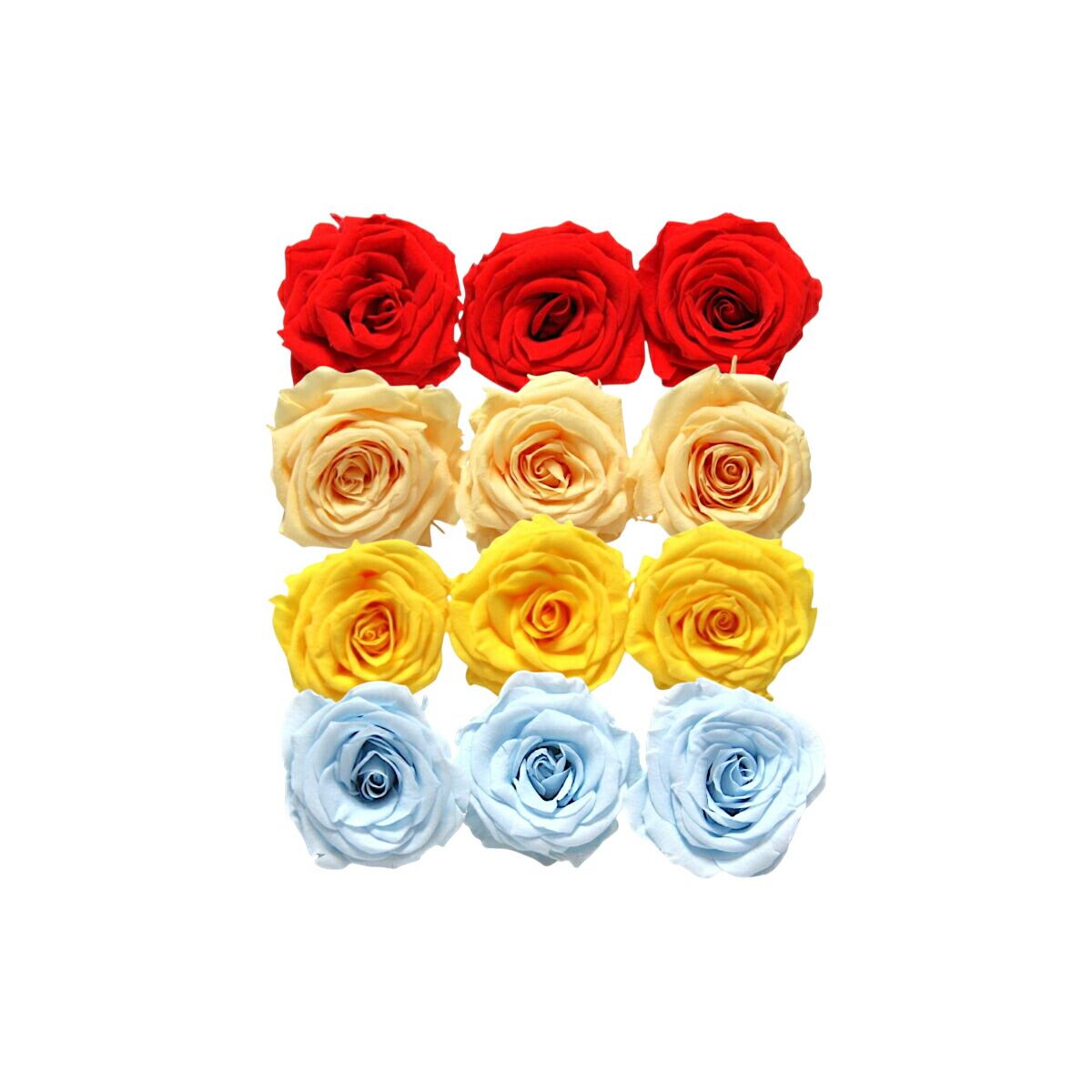 大地農園!プリザーブドフラワー「シャーロット 4色×3輪アソート 計12輪」「レッド ジュリアオレンジ ミモザイエロー ベビーブルー」プリザ 花材 ハーバリウム おしゃれ ピンク バラ かわいい プレゼント 贈り物 オオチノウエン