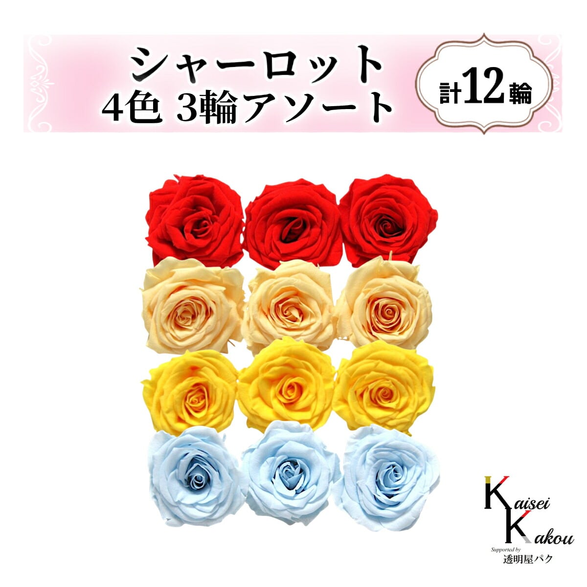 大地農園!プリザーブドフラワー「シャーロット 4色×3輪アソート 計12輪」「レッド ジュリアオレンジ ミモザイエロー ベビーブルー」プリザ 花材 ハーバリウム おしゃれ ピンク バラ かわいい プレゼント 贈り物 オオチノウエン 自然からの贈り物。大地農園プリザーブドフラワー! ●シャーロット 4色×各3輪 計12輪のアソートセット【セット内容 各3輪】・レッド・ジュリアオレンジ・ミモザイエロー・ベビーブルー花径:3.4〜4cmφ花丈:約2〜2.5cmかわいらしいシャーロット。薔薇の花言葉は「美」「愛」。 誕生日など特別な日のお祝いや、記念日、大切な人に贈り物をする際によく選ばれています。リース、ワックスサシェや髪飾りなど…様々なスタイルやアレンジで使うことができます。●取扱いの注意プリザーブドフラワーは湿気をとても嫌います。湿度の高い場所では枝や茎の切り口や表面から保存液や染料が染み出すことがあり、衣服などを汚す恐れがあります。ご使用の際には充分ご注意ください。※なるべくふんわりと梱包いたしますが、配送による破損、潰れ、ほころびなどが生じることがございます。ご心配な方は宅配便をご指定下さい。※配送の都合上、商品を箱に直接梱包することもございます。※配送の都合上、使えない根元の部分はカットする場合があります。重量はカット前の重量となります。※高温多湿の場所では染料が切り口や表面からもれることがありますので、ご注意ください。※天然素材を使用している為、商品により色、サイズなど多少の違いが生じる場合がございます。※パッケージデザイン等が予告なく変更される場合もあります。※商品廃番・メーカー欠品など諸事情によりお届けできない場合がございます。※上記内容におけます返品交換は承れませんので、あらかじめご了承ください。 5