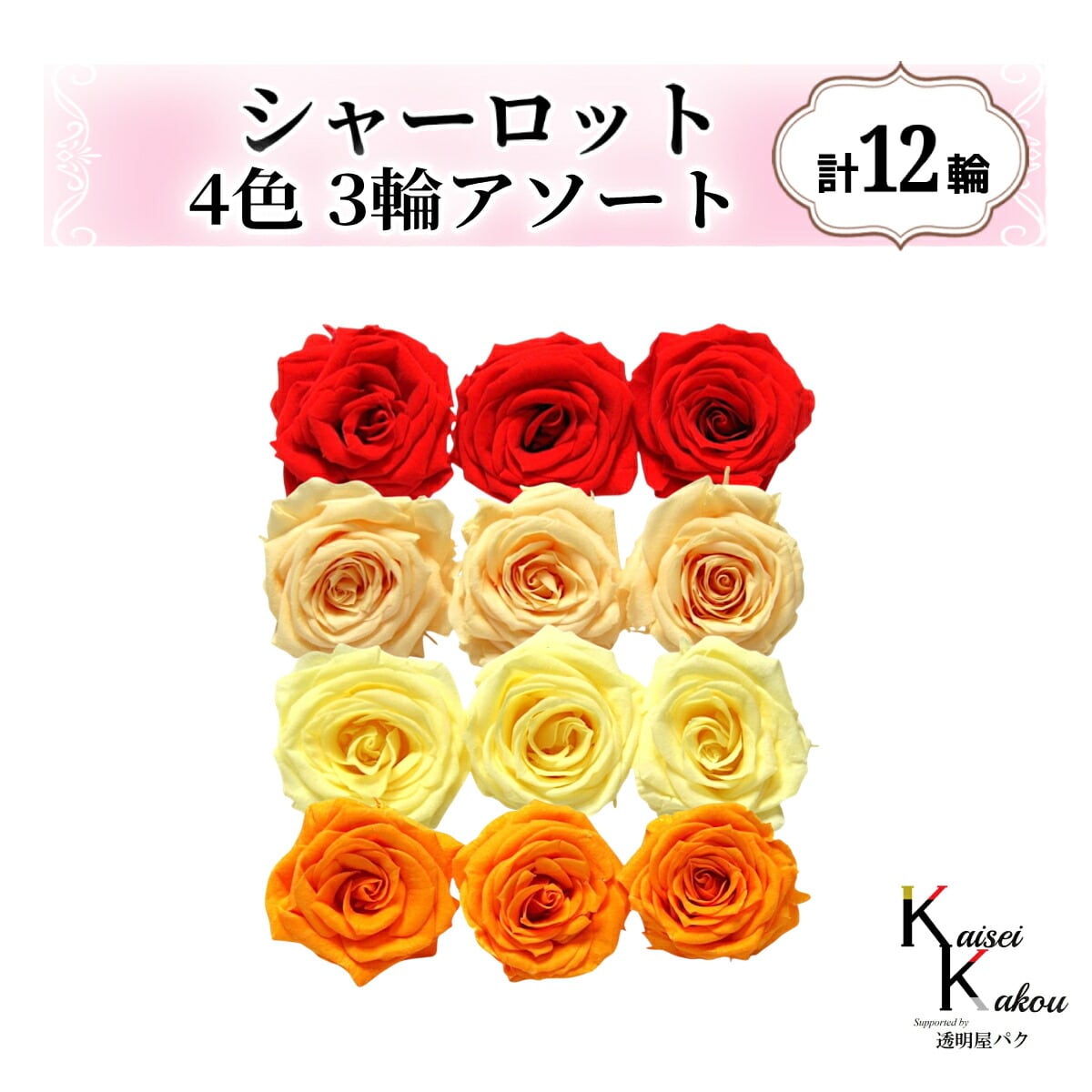 大地農園!プリザーブドフラワー「シャーロット 4色×3輪アソート 計12輪」「レッド ジュリアオレンジ モーニングイエロー フルーティオレンジ」プリザ 花材 ハーバリウム おしゃれ ピンク バラ かわいい プレゼント 贈り物 オオチノウエン