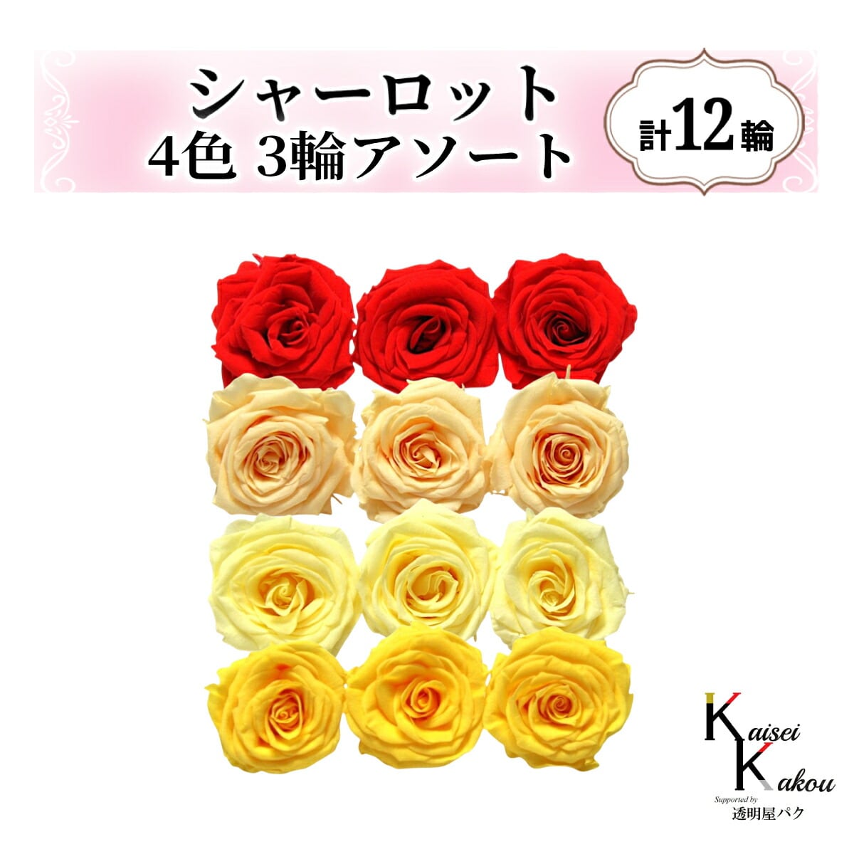 大地農園!プリザーブドフラワー「シャーロット 4色×3輪アソート 計12輪」「レッド ジュリアオレンジ モーニングイエロー ミモザイエロー」プリザ 花材 ハーバリウム おしゃれ ピンク バラ かわいい プレゼント 贈り物 オオチノウエン