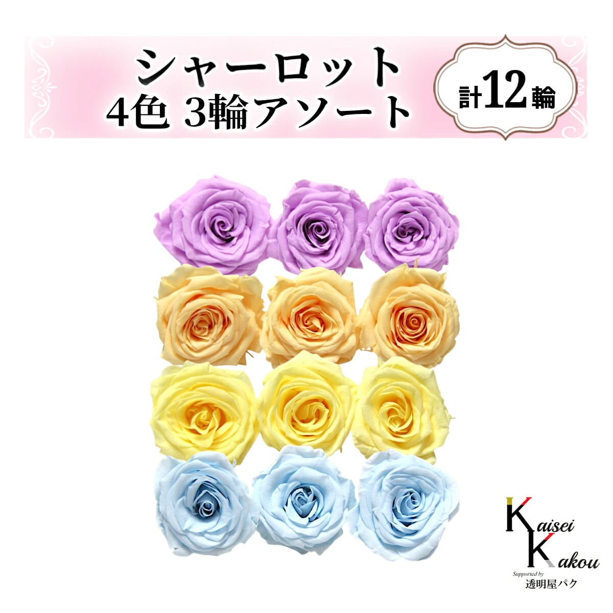 大地農園!プリザーブドフラワー「シャーロット 4色×3輪アソート 計12輪」「スウィートライラック ジュリアオレンジ モーニングイエロー ベビーブルー」プリザ 花材 ハーバリウム おしゃれ ピンク バラ かわいい プレゼント 贈り物 オオチノウエン