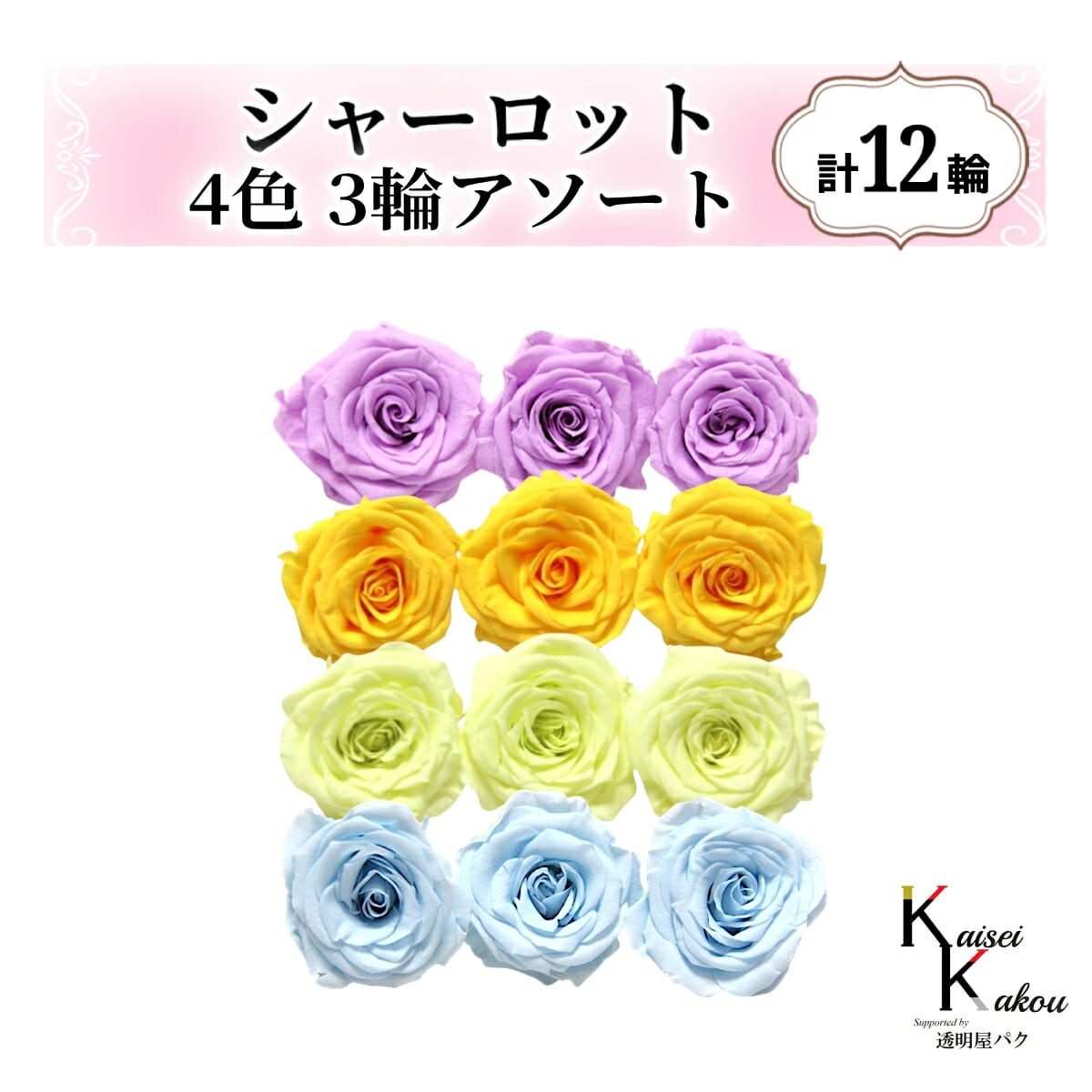 大地農園!プリザーブドフラワー「シャーロット 4色×3輪アソート 計12輪」「スウィートライラック ミモザイエロー フレッシュグリーン ベビーブルー」プリザ 花材 ハーバリウム おしゃれ ピンク バラ かわいい プレゼント 贈り物 オオチノウエン