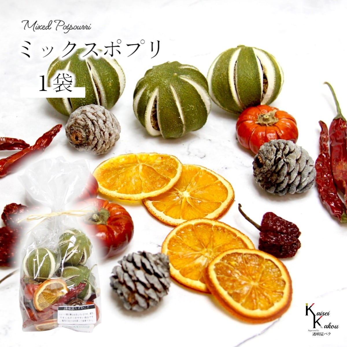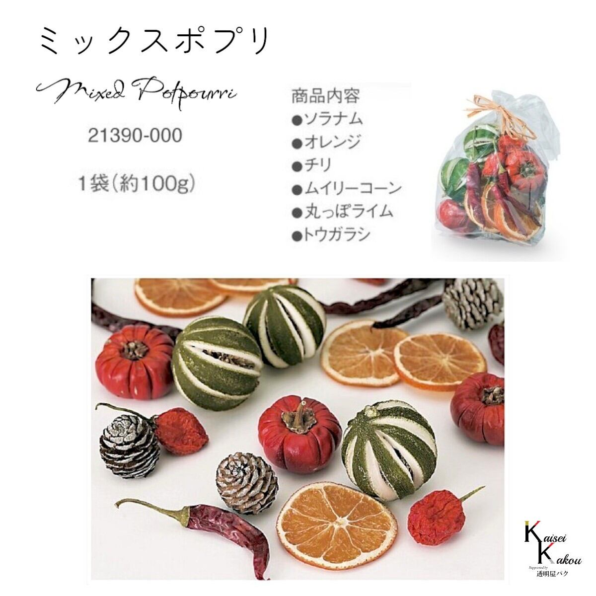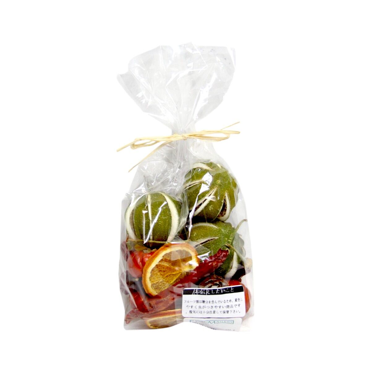 大地農園! プリザーブドフラワー 「ミックスポプリ 1袋(100g)」 フルーツ プリザ 果物 オレンジ アップル 装飾 ハーバリウム おしゃれ かわいい プレゼント 贈り物 オオチノウエン 自然からの贈り物。大地農園プリザーブドフラワー! ソラナム、オレンジ、チリ、ムイリーコーン、丸っぽライム、トウガラシが入っています。フルーツを使ったアレンジに便利にお使いいただけます。1袋(100g分)※なるべくふんわりと梱包いたしますが、配送による破損、潰れ、ほころびなどが生じることがございます。ご心配な方は宅配便をご指定下さい。※フルーツ類は糖分を含んでいる為、変色しやすく虫がつきやすい商品です。湿気には十分注意して保管して下さい。※配送の都合上、商品を箱に直接梱包することもございます。※高温多湿の場所では染料が切り口や表面からもれることがありますので、ご注意ください。※天然素材を使用している為、商品により色、サイズなど多少の違いが生じる場合がございます。※上記内容におけます返品交換は承れませんので、あらかじめご了承ください。※パッケージデザイン等が予告なく変更される場合もあります。※商品廃番・メーカー欠品など諸事情によりお届けできない場合がございます。取扱いの注意プリザーブドフラワーは湿気をとても嫌います。湿度の高い場所では枝や茎の切り口や表面から保存液や染料が染み出すことがあり、衣服などを汚す恐れがあります。ご使用の際には充分ご注意ください。 5