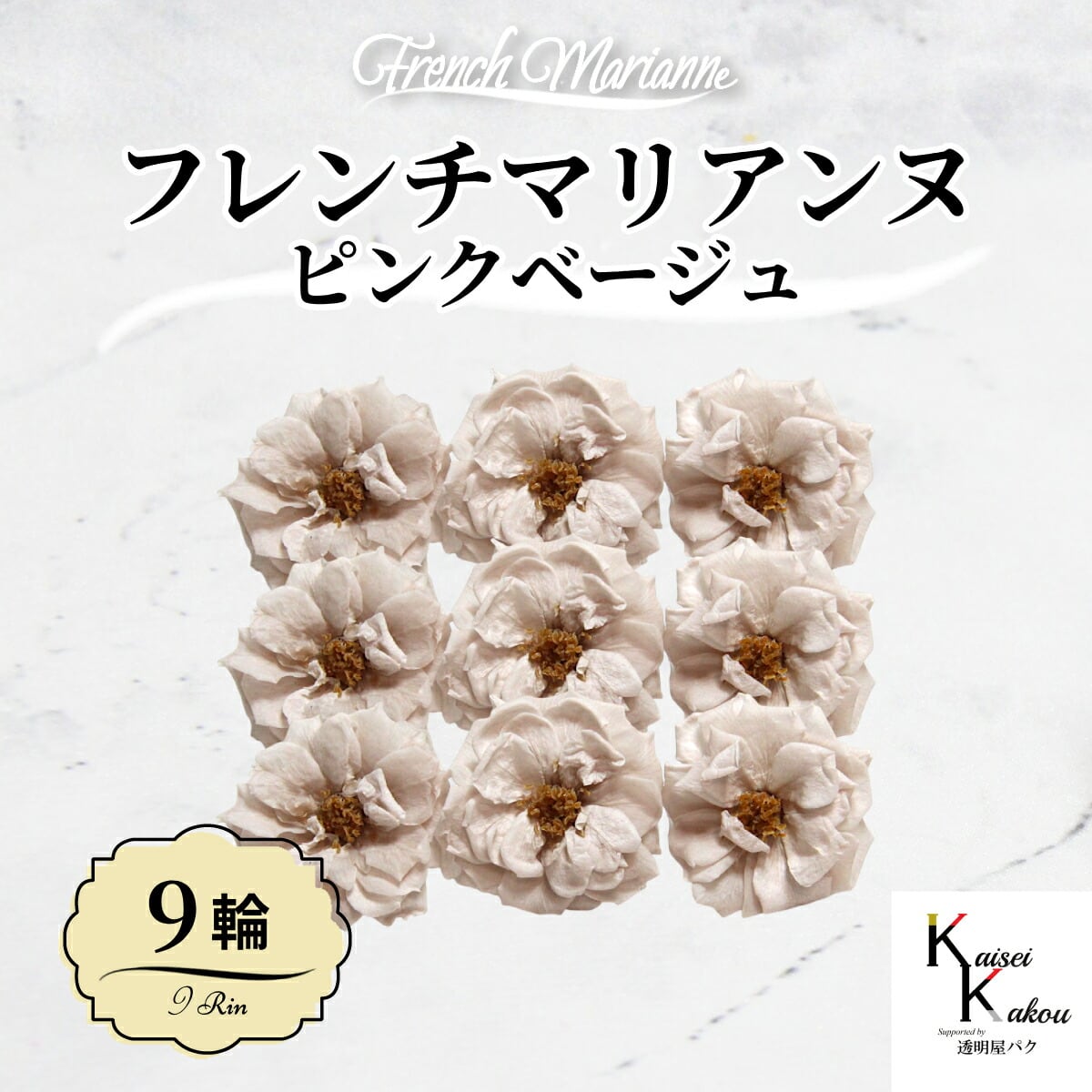 大地農園!プリザーブドフラワー 「フレンチマリアンヌ 9輪 ピンクベージュ」 プリザ 花材 ハーバリウム おしゃれ かわいい プレゼント 贈り物 オオチノウエン バラ 薔薇 ローズ rose 自然からの贈り物。大地農園プリザーブドフラワー! 花径:約4〜5cmφ花丈:約1.5〜2cmフレンチマリアンヌは平咲きの花形が特徴的なプリザーブドローズです。庭咲きのバラを思わせる、柔らかく上品な雰囲気が人気です。本商品は素材の特性上、花びらが少し押されたような状態になっていたり、中心部分が内側に折れ込んでいる場合がございます。また、サイズや色味は写真と異なります。あらかじめご理解いただき、商品の風合いとしてお楽しみください。●取扱いの注意プリザーブドフラワーは湿気をとても嫌います。湿度の高い場所では枝や茎の切り口や表面から保存液や染料が染み出すことがあり、衣服などを汚す恐れがあります。ご使用の際には充分ご注意ください。※なるべくふんわりと梱包いたしますが、配送による破損、潰れ、ほころびなどが生じることがございます。ご心配な方は宅配便をご指定下さい。※配送の都合上、商品を箱に直接梱包することもございます。※配送の都合上、使えない根元の部分はカットする場合があります。重量はカット前の重量となります。※高温多湿の場所では染料が切り口や表面からもれることがありますので、ご注意ください。※天然素材を使用している為、商品により色、サイズなど多少の違いが生じる場合がございます。※パッケージデザイン等が予告なく変更される場合もあります。※商品廃番・メーカー欠品など諸事情によりお届けできない場合がございます。※上記内容におけます返品交換は承れませんので、あらかじめご了承ください。 5