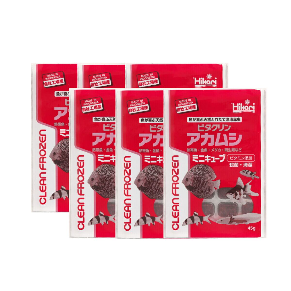 「 ビタクリンアカムシミニキューブ 6箱 45g×72枚 キョーリン 冷凍餌 」魚のえさ 赤虫 天然飼料 超急速冷凍 金魚 鯉 ディスカス エンゼルフィッシュ グッピー 淡水魚 ミニキューブ 生体そのままの新鮮さを超急速冷凍!複数工程で殺菌。マルチビタミンも添加し、清潔で栄養が強化された冷凍赤虫です。 赤虫は嗜好性・栄養価に優れたあらゆる淡水魚に最適な天然飼料です。弊社でも長期単独給餌による健全な成長を確認しています。複数の工程で雑菌・病原菌を殺菌し、マルチビタミンを添加して栄養を強化しました。デリケートな赤虫の細胞を壊さないよう超急速冷凍していますので、栄養分の流出も少なく、水もほとんど汚しません。薬の錠剤と同様のPTP包装が空気を遮断し、変質を防ぎます。また、中身が手に触れる事無く取り出すことができます。ビタクリンアカムシのキューブ内容量を少なくしました。1キューブ辺りの重量は従来品の半分弱です。(45gで32キューブ)小型水槽や少数飼育のユーザーにお勧めです。【対象魚】ディスカス、エンゼルフィッシュなどの中型熱帯魚、グッピーなどの小型熱帯魚、金魚、鯉 他【与え方】冷凍のまま折るようにキューブを指で押すと、アルミ箔が破れて取り出せます。凍ったままか別容器に溶かし、数分で食べ切る量を与えてください。一度解凍された商品は再冷凍しないでください。細胞が破れ水を汚す原因になります。天然の原料を使用し、着色料無添加なため、色が異なる場合がございますが、魚に対する栄養学的な品質差はありません。使用の際、体質によってはかゆみ・発疹が現れることがあります。赤虫の成虫であるユスリカはアレルギーの原因物質として知られており、ユスリカの幼虫である赤虫も体質によってはアレルギーを引き起こすことがあります。痒みや蕁麻疹などの症状が見られたら直ちに使用を止めて、まずは触った箇所をよく洗ってください。また、症状がひどいようなら病院の診察を受けることをお勧めします。使用を続けることでアレルギー体質になることもありますのでご注意ください。 5