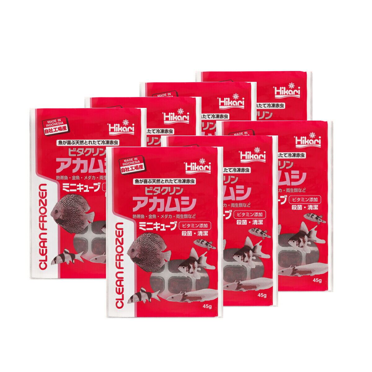 「 ビタクリンアカムシミニキューブ 45g×7枚 キョーリン 冷凍餌 」魚のえさ 赤虫 天然飼料 超急速冷凍 金魚 鯉 ディスカス エンゼルフィッシュ グッピー 淡水魚 ミニキューブ 生体そのままの新鮮さを超急速冷凍!複数工程で殺菌。マルチビタミンも添加し、清潔で栄養が強化された冷凍赤虫です。 赤虫は嗜好性・栄養価に優れたあらゆる淡水魚に最適な天然飼料です。弊社でも長期単独給餌による健全な成長を確認しています。複数の工程で雑菌・病原菌を殺菌し、マルチビタミンを添加して栄養を強化しました。デリケートな赤虫の細胞を壊さないよう超急速冷凍していますので、栄養分の流出も少なく、水もほとんど汚しません。薬の錠剤と同様のPTP包装が空気を遮断し、変質を防ぎます。また、中身が手に触れる事無く取り出すことができます。ビタクリンアカムシのキューブ内容量を少なくしました。1キューブ辺りの重量は従来品の半分弱です。(45gで32キューブ)小型水槽や少数飼育のユーザーにお勧めです。【対象魚】ディスカス、エンゼルフィッシュなどの中型熱帯魚、グッピーなどの小型熱帯魚、金魚、鯉 他【与え方】冷凍のまま折るようにキューブを指で押すと、アルミ箔が破れて取り出せます。凍ったままか別容器に溶かし、数分で食べ切る量を与えてください。一度解凍された商品は再冷凍しないでください。細胞が破れ水を汚す原因になります。天然の原料を使用し、着色料無添加なため、色が異なる場合がございますが、魚に対する栄養学的な品質差はありません。使用の際、体質によってはかゆみ・発疹が現れることがあります。赤虫の成虫であるユスリカはアレルギーの原因物質として知られており、ユスリカの幼虫である赤虫も体質によってはアレルギーを引き起こすことがあります。痒みや蕁麻疹などの症状が見られたら直ちに使用を止めて、まずは触った箇所をよく洗ってください。また、症状がひどいようなら病院の診察を受けることをお勧めします。使用を続けることでアレルギー体質になることもありますのでご注意ください。 5