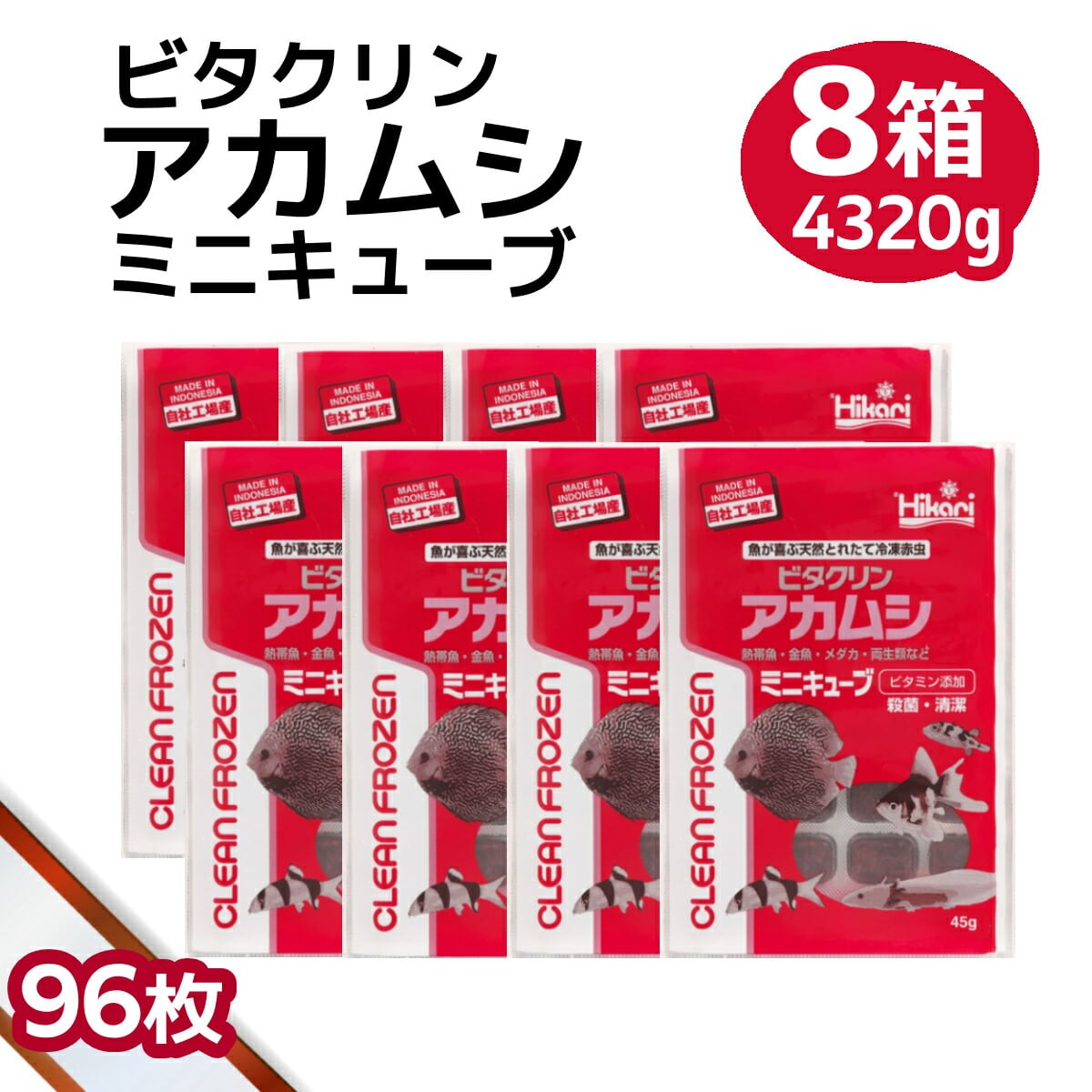 「 ビタクリンアカムシミニキューブ 8箱 45g×96枚 キョーリン 冷凍餌 」魚のえさ 赤虫 天然飼料 超急速冷凍 金魚 鯉 ディスカス エンゼルフィッシュ グッピー 淡水魚 ミニキューブ 生体そのままの新鮮さを超急速冷凍!複数工程で殺菌。マルチビタミンも添加し、清潔で栄養が強化された冷凍赤虫です。 赤虫は嗜好性・栄養価に優れたあらゆる淡水魚に最適な天然飼料です。弊社でも長期単独給餌による健全な成長を確認しています。複数の工程で雑菌・病原菌を殺菌し、マルチビタミンを添加して栄養を強化しました。デリケートな赤虫の細胞を壊さないよう超急速冷凍していますので、栄養分の流出も少なく、水もほとんど汚しません。薬の錠剤と同様のPTP包装が空気を遮断し、変質を防ぎます。また、中身が手に触れる事無く取り出すことができます。ビタクリンアカムシのキューブ内容量を少なくしました。1キューブ辺りの重量は従来品の半分弱です。(45gで32キューブ)小型水槽や少数飼育のユーザーにお勧めです。【対象魚】ディスカス、エンゼルフィッシュなどの中型熱帯魚、グッピーなどの小型熱帯魚、金魚、鯉 他【与え方】冷凍のまま折るようにキューブを指で押すと、アルミ箔が破れて取り出せます。凍ったままか別容器に溶かし、数分で食べ切る量を与えてください。一度解凍された商品は再冷凍しないでください。細胞が破れ水を汚す原因になります。天然の原料を使用し、着色料無添加なため、色が異なる場合がございますが、魚に対する栄養学的な品質差はありません。使用の際、体質によってはかゆみ・発疹が現れることがあります。赤虫の成虫であるユスリカはアレルギーの原因物質として知られており、ユスリカの幼虫である赤虫も体質によってはアレルギーを引き起こすことがあります。痒みや蕁麻疹などの症状が見られたら直ちに使用を止めて、まずは触った箇所をよく洗ってください。また、症状がひどいようなら病院の診察を受けることをお勧めします。使用を続けることでアレルギー体質になることもありますのでご注意ください。 5