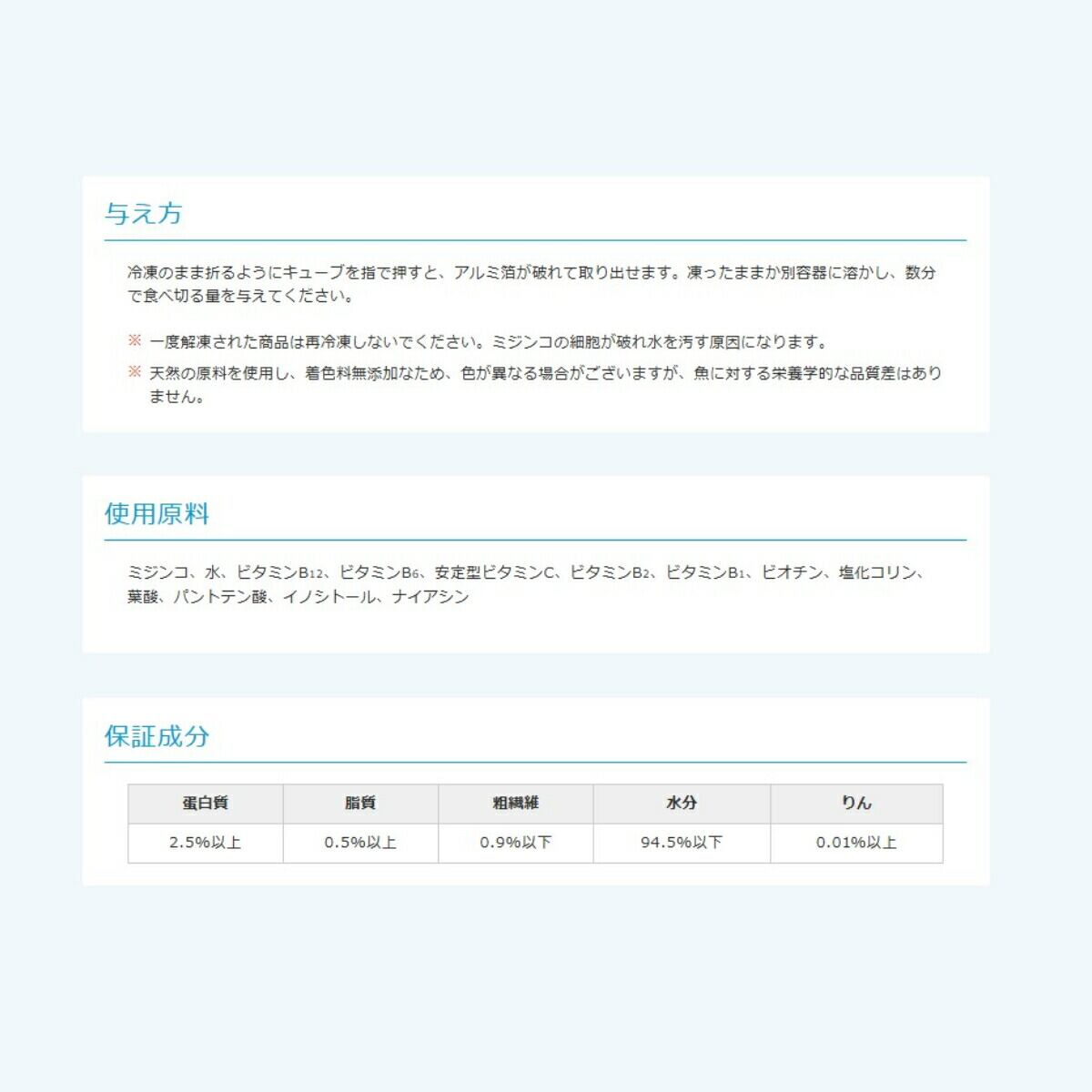 「 ビタクリンミジンコ 100g×8枚 キョーリン 冷凍餌 」魚のえさ みじんこ 天然飼料 超急速冷凍 ネオンテトラ グッピー ラスボラ 小型熱帯魚 稚魚 幼魚 小型海水魚 イソギンチャク ビタミンを添加した、クリーンフローズンフード。とれたてのミジンコを独自の技術で洗浄・殺菌。マルチビタミンも添加し、清潔で栄養が強化された冷凍フードです とれたてのミジンコを独自の技術で傷つける事無く洗浄し、複数の工程で病原菌を殺菌。さらにマルチビタミンを添加した、清潔で栄養が強化された冷凍フードです。ミジンコは、冷凍赤虫が口に入らないようなメダカや小型熱帯魚が食べやすい大きさです。また金魚をはじめ様々な魚種の幼稚魚に最適です。良質な脂質である不飽和脂肪酸を多く含んでいます。カロチノイドを豊富に含み、赤の色揚げ効果が期待できます。新鮮な原料を生のままパッキングし、超低温下で瞬間的に凍結させることで鮮度の高さを保持しています。薬の錠剤と同様のPTP包装が空気を遮断し、変質を防ぎます。また、中身が手に触れる事無く取り出すことができます。【対象魚】ネオンテトラ、グッピー、ラスボラ等小型熱帯魚、ディスカス等の稚魚、幼魚全般、小型海水魚、イソギンチャク 他【与え方】冷凍のまま折るようにキューブを指で押すと、アルミ箔が破れて取り出せます。凍ったままか別容器に溶かし、数分で食べ切る量を与えてください。一度解凍された商品は再冷凍しないでください。ミジンコの細胞が破れ水を汚す原因になります。天然の原料を使用し、着色料無添加なため、色が異なる場合がございますが、魚に対する栄養学的な品質差はありません。 5