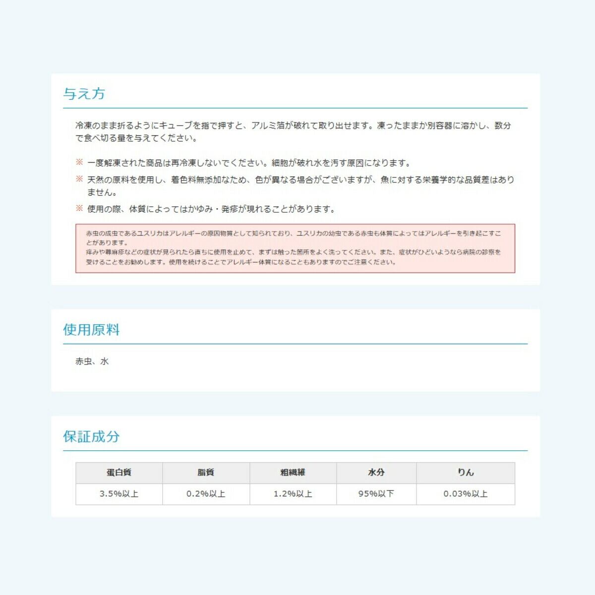 「 エコクリンアカムシ 1枚 100g キョーリン 冷凍餌 」魚のえさ 赤虫 天然飼料 超急速冷凍 金魚 鯉 エンゼルフィッシュ グッピー 淡水魚 生体そのままの新鮮さを超急速冷凍!紫外線パワーで強力に殺菌、超急速冷凍した生体そのままの新鮮な冷凍赤虫です。 【キョーリン 冷凍エサ エコクリンアカムシ】生体そのままの新鮮さを超急速冷凍!紫外線パワーで強力に殺菌、超急速冷凍した生体そのままの新鮮な冷凍赤虫です。1.赤虫は嗜好性・栄養価に優れたあらゆる淡水魚に最適な天然飼料です。キョーリン社でも単独給餌による乾山な成長を確認しています。2.赤虫原料は紫外線で殺菌処理し、雑菌がほとんど含まれません。3.デリケートな赤虫の細胞を壊さないよう超急速冷凍していますので、栄養分の流出も少なく、水もほとんどよごしません。4.薬の錠剤と同様のPTP包装が空気を遮断し、変質を防ぎます。また、中身が手に触れる事なく取り出すことができます。【対象魚】金魚、鯉、エンゼルフィッシュなどの中型熱帯魚、グッピーなどの小型熱帯魚【与え方】冷凍のまま折るようにキューブを指で押すと、アルミ箔が破れて取り出せます。凍ったままか別容器に溶かし、数分で食べきる量を与えてください。※一度解凍された商品は再冷凍しないでください。細胞が破れ水を汚す原因になります。※天然の原料を使用し、着色料無添加なため、色が事なる場合がございますが、魚に対する栄養学的な品質差はありません。※使用の際、体質によってはかゆみ・発疹が現れることがあります。赤虫の成虫であるユスリカはアレルギーの原因物質として知られており、ユスリカの幼虫である赤虫も体質によってはアレルギーを引き起こすことがあります。かゆみや蕁麻疹などの症状が見られたら直ちに使用を止めて、まずは触った箇所をよく洗ってください。また、症状がひどいようなら病院の診察を受けることをお勧めします。使用を続けることでアレルギー体質になる事もありますのでご注意ください。■使用原料赤虫、水■保証成分蚕白質3.5%以上、脂質0.2%以上、粗繊維1.2%以上、水分95%以下、りん0.03%以上 5