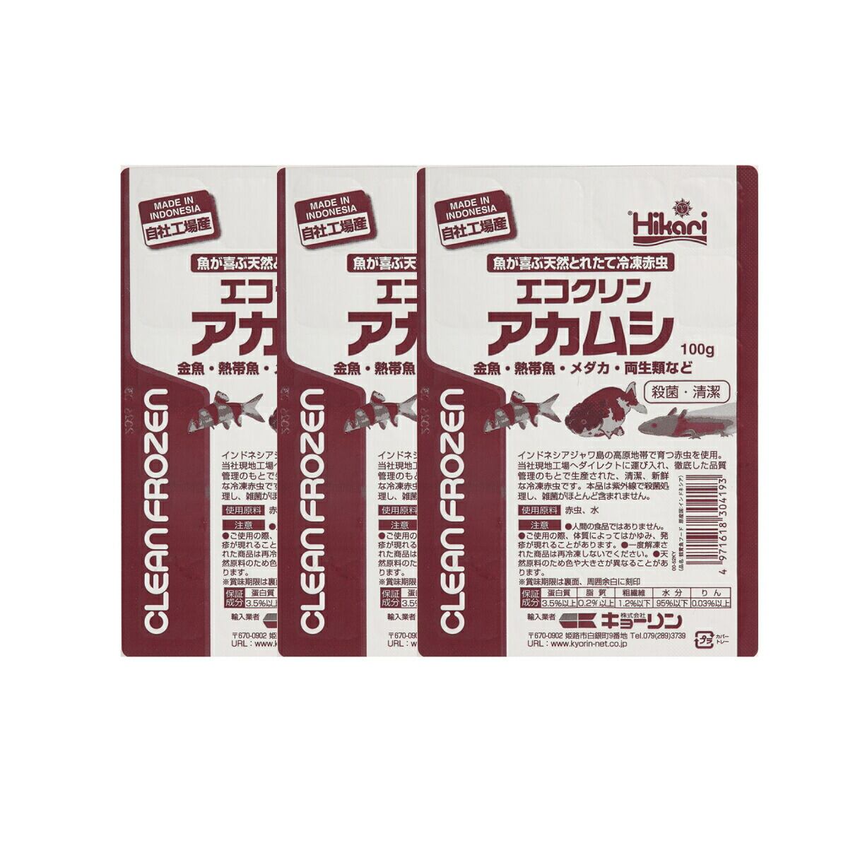 「 エコクリンアカムシ 3箱 100g×54枚 キョーリン 冷凍餌 」魚のえさ 赤虫 天然飼料 超急速冷凍 金魚 鯉 エンゼルフィッシュ グッピー 淡水魚 生体そのままの新鮮さを超急速冷凍!紫外線パワーで強力に殺菌、超急速冷凍した生体そのままの新鮮な冷凍赤虫です。 【キョーリン 冷凍エサ エコクリンアカムシ】生体そのままの新鮮さを超急速冷凍!紫外線パワーで強力に殺菌、超急速冷凍した生体そのままの新鮮な冷凍赤虫です。1.赤虫は嗜好性・栄養価に優れたあらゆる淡水魚に最適な天然飼料です。キョーリン社でも単独給餌による乾山な成長を確認しています。2.赤虫原料は紫外線で殺菌処理し、雑菌がほとんど含まれません。3.デリケートな赤虫の細胞を壊さないよう超急速冷凍していますので、栄養分の流出も少なく、水もほとんどよごしません。4.薬の錠剤と同様のPTP包装が空気を遮断し、変質を防ぎます。また、中身が手に触れる事なく取り出すことができます。【対象魚】金魚、鯉、エンゼルフィッシュなどの中型熱帯魚、グッピーなどの小型熱帯魚【与え方】冷凍のまま折るようにキューブを指で押すと、アルミ箔が破れて取り出せます。凍ったままか別容器に溶かし、数分で食べきる量を与えてください。※一度解凍された商品は再冷凍しないでください。細胞が破れ水を汚す原因になります。※天然の原料を使用し、着色料無添加なため、色が事なる場合がございますが、魚に対する栄養学的な品質差はありません。※使用の際、体質によってはかゆみ・発疹が現れることがあります。赤虫の成虫であるユスリカはアレルギーの原因物質として知られており、ユスリカの幼虫である赤虫も体質によってはアレルギーを引き起こすことがあります。かゆみや蕁麻疹などの症状が見られたら直ちに使用を止めて、まずは触った箇所をよく洗ってください。また、症状がひどいようなら病院の診察を受けることをお勧めします。使用を続けることでアレルギー体質になる事もありますのでご注意ください。■使用原料赤虫、水■保証成分蚕白質3.5%以上、脂質0.2%以上、粗繊維1.2%以上、水分95%以下、りん0.03%以上 5
