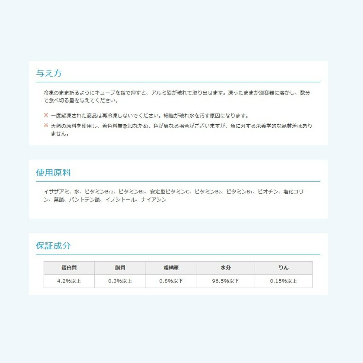 「 ビタクリンホワイトシュリンプ 100g×3枚 キョーリン 冷凍餌 」魚のえさ イサザアミ 天然飼料 超急速冷凍 スズメ クマノミ チョウチョウウオ 小型 中型 海水魚 タツノオトシゴ ビタミン添加のクリーンフローズンフード。とれたてのイサザアミを独自の技術で洗浄・殺菌。マルチビタミンも添加し、清潔で栄養が強化された冷凍フードです。 とれたてのイサザアミを独自の技術で傷つける事無く洗浄し、複数の工程で病原菌を殺菌。さらにマルチビタミンを添加した、清潔で栄養が強化された冷凍フードです。イサザアミは蛋白質、脂質の含有量が高く、DHA、EPAを多く含み、海水魚の栄養要求を満たします。カロチノイドを豊富に含み、赤の色揚げ効果が期待できます。新鮮な原料を生のままパッキングし、超低温下で瞬間的に凍結させることで鮮度の高さを保持しています。薬の錠剤と同様のPTP包装が空気を遮断し、変質を防ぎます。また、中身が手に触れる事無く取り出すことができます。【対象魚】スズメ、クマノミ、チョウチョウウオ等小型〜中型以上の海水魚全般、タツノオトシゴ【与え方】冷凍のまま折るようにキューブを指で押すと、アルミ箔が破れて取り出せます。凍ったままか別容器に溶かし、数分で食べ切る量を与えてください。※一度解凍された商品は再冷凍しないでください。細胞が破れ水を汚す原因になります。※天然の原料を使用し、着色料無添加なため、色が異なる場合がございますが、魚に対する栄養学的な品質差はありません。 5