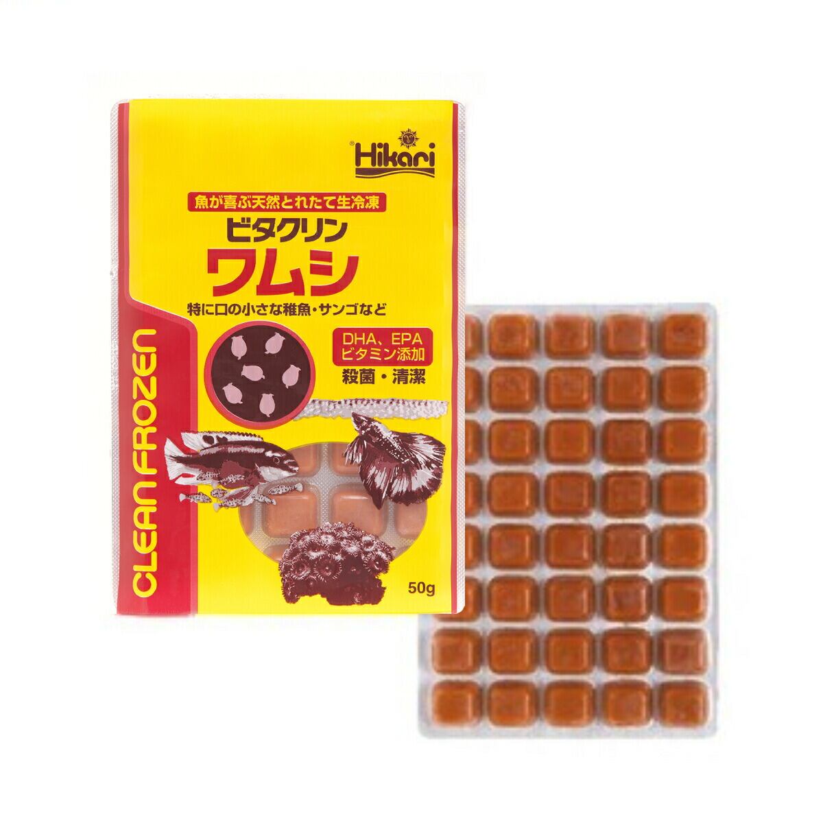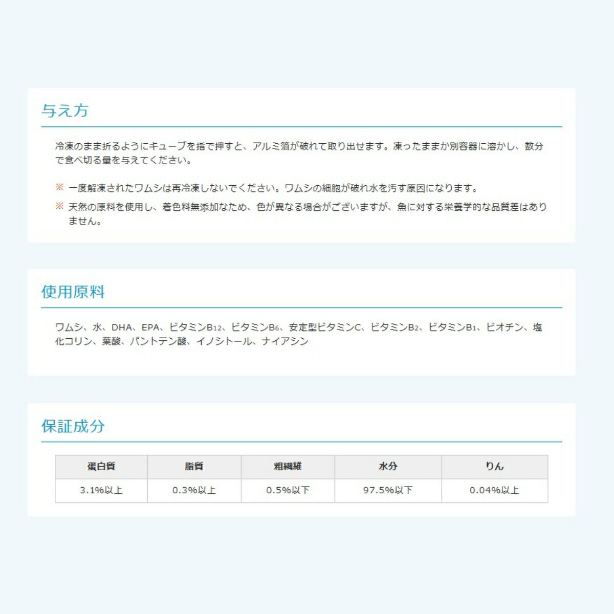 「 ビタクリンワムシ 4箱 50g×72枚 キョーリン 冷凍餌 」魚のえさ わむし 天然飼料 超急速冷凍 熱帯魚 金魚 稚魚 熱帯魚 海水魚 プランクトン サンゴ ビタミン添加のクリーンフローズンフード。ブラインシュリンプ幼生が食べられないような口の小さな稚魚に最適な動物プランクトン、ワムシを天然とれたて生冷凍した冷凍フードです。 とれたてのワムシを独自の技術で傷つける事無く洗浄し、複数の工程で病原菌を殺菌しました。良質な脂質である不飽和脂肪酸(DHA、EPA)に加えマルチビタミンを添加し栄養を強化しました。淡水魚から海水魚にまで与えることができます。新鮮な原料を生のままパッキングし、超低温下で瞬間的に凍結させることで鮮度の高さを保持しています。薬の錠剤と同様のPTP包装が空気を遮断し、変質を防ぎます。また、中身が手に触れる事無く取り出すことができます。【対象魚】淡水魚、海水魚を問わず稚魚全般(口の小さな卵生魚の稚魚に対応)。プランクトンフィーダーの魚、サンゴ等【与え方】冷凍のまま折るようにキューブを指で押すと、アルミ箔が破れて取り出せます。凍ったままか別容器に溶かし、数分で食べ切る量を与えてください。※一度解凍されたワムシは再冷凍しないでください。ワムシの細胞が破れ水を汚す原因になります。※天然の原料を使用し、着色料無添加なため、色が異なる場合がございますが、魚に対する栄養学的な品質差はありません。 5
