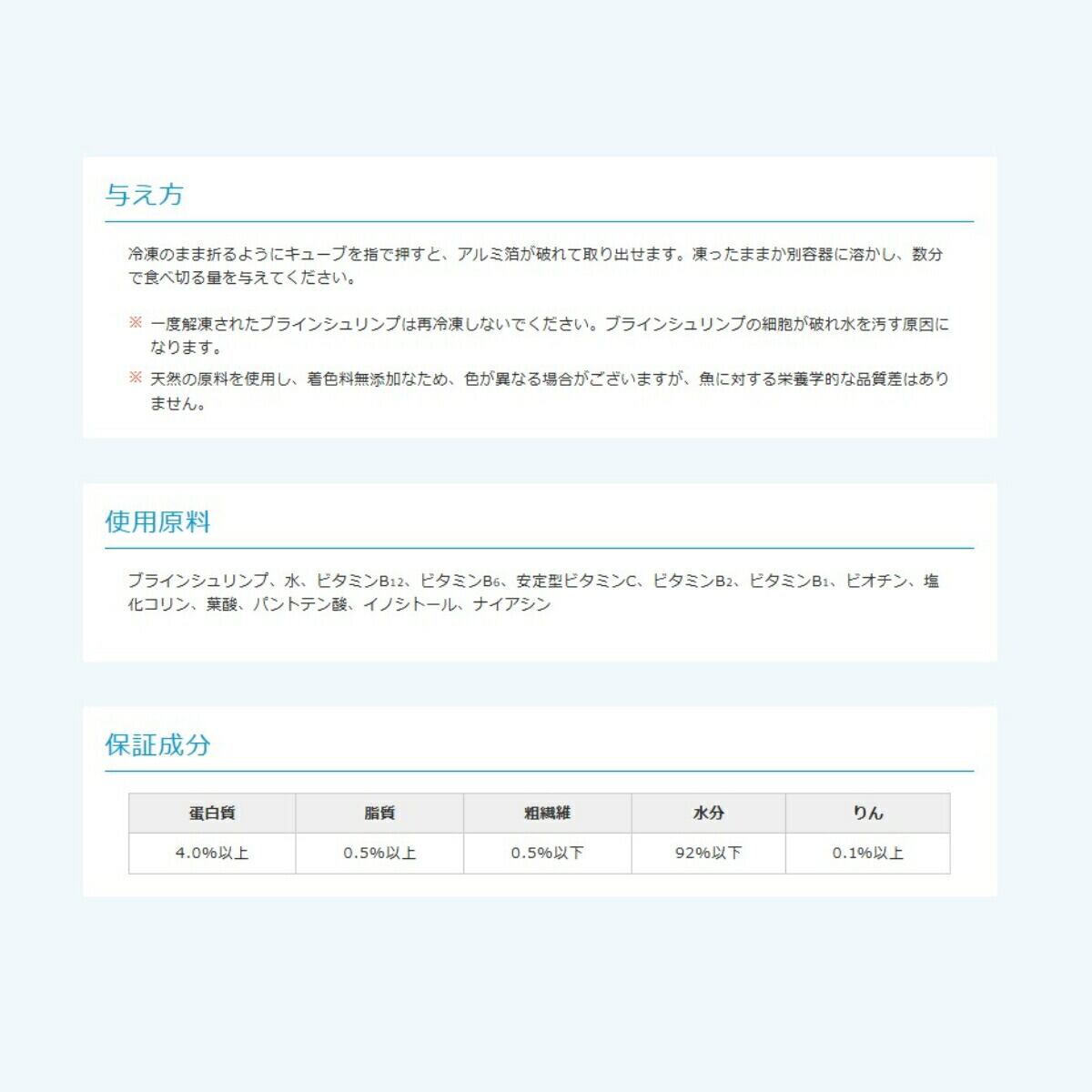 「 ビタクリンアダルトブライン ミニキューブ 5箱 45g×60枚 キョーリン 冷凍餌 」魚のえさ ブラインシュリンプ 天然飼料 超急速冷凍 ディスカス エンゼルフィッシュ ドワーフシクリッド ミドリフグ 中型熱帯魚 金魚 海水魚 イソギンチャク ビタミンを添加した、クリーンフローズンフード。とれたてのブラインシュリンプを独自の技術で洗浄・殺菌。マルチビタミンも添加し、清潔で栄養が強化された冷凍フードです。 とれたてのブラインシュリンプを独自の技術で傷つける事無く洗浄し、複数の工程で病原菌を殺菌。さらにマルチビタミンを添加した、清潔で栄養が強化された冷凍フードです。ブラインシュリンプ幼生が植物プランクトンを栄養源として成長したアダルトブラインシュリンプです。良質な脂質である不飽和脂肪酸を多く含み、海水魚の栄養要求を満たし、様々な淡水魚にも与えることができます。カロチノイドを豊富に含み、赤の色揚げ効果が期待できます。新鮮な原料を生のままパッキングし、超低温下で瞬間的に凍結させることで鮮度の高さを保持しています。薬の錠剤と同様のPTP包装が空気を遮断し、変質を防ぎます。また、中身が手に触れる事無く取り出すことができます。ビタクリンアダルトブラインのキューブ内容量を少なくしました。1キューブ辺りの重量は従来品の約3分の1です。(45gで40キューブ)小型水槽や少数飼育のユーザーにお勧めです。【対象魚】ディスカス、エンゼルフィッシュ、ドワーフシクリッド、ミドリフグ等中型熱帯魚、金魚、海水魚、イソギンチャク 他【与え方】冷凍のまま折るようにキューブを指で押すと、アルミ箔が破れて取り出せます。凍ったままか別容器に溶かし、数分で食べ切る量を与えてください。※一度解凍されたブラインシュリンプは再冷凍しないでください。ブラインシュリンプの細胞が破れ水を汚す原因になります。※天然の原料を使用し、着色料無添加なため、色が異なる場合がございますが、魚に対する栄養学的な品質差はありません。 5