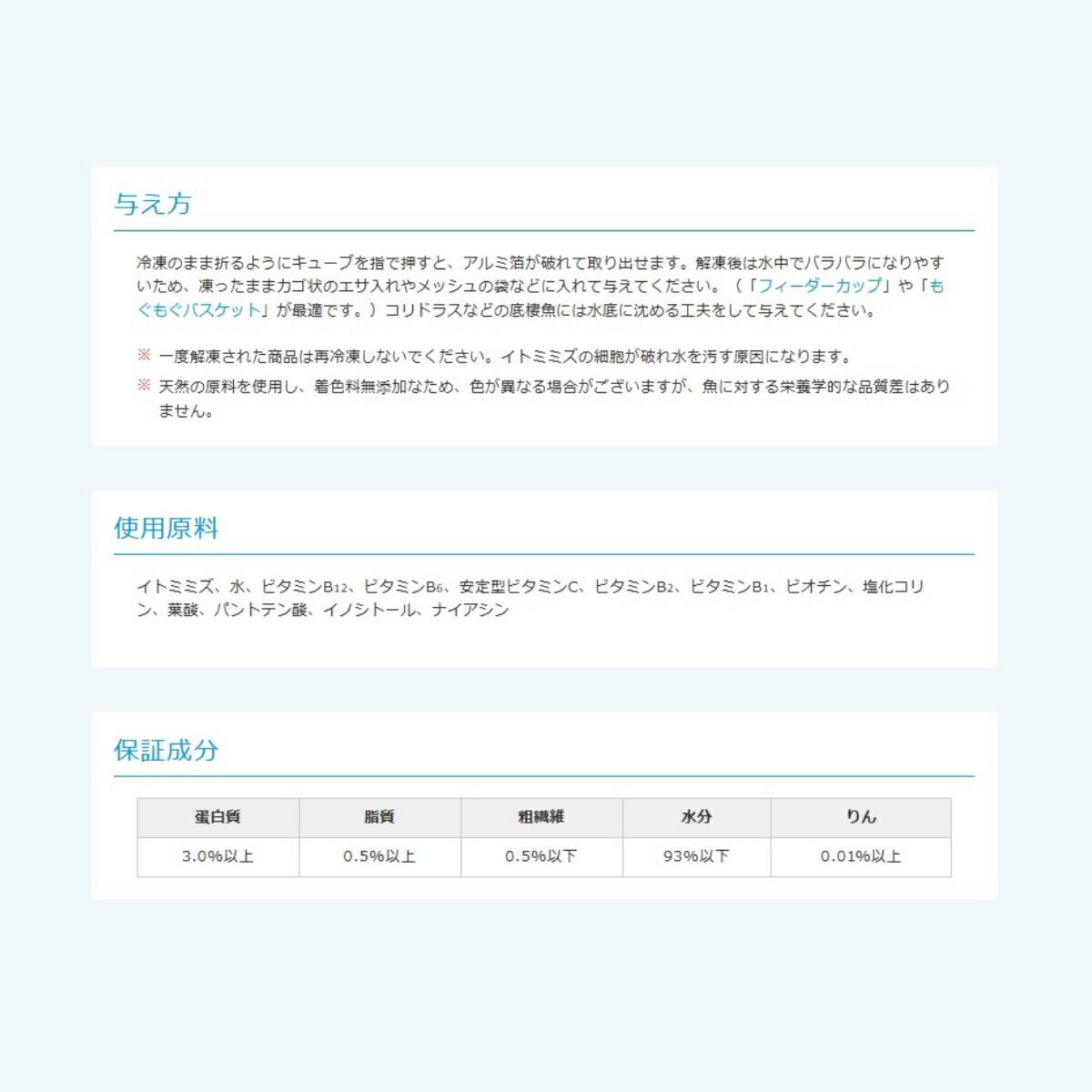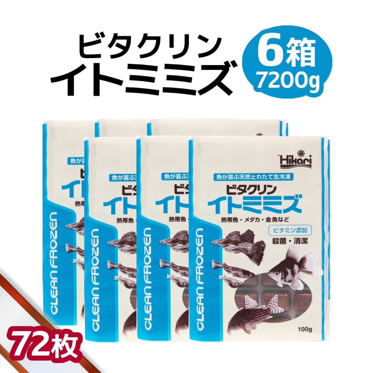 「 ビタクリンイトミミズ 6箱 100g×72枚 キョーリン 冷凍餌 」魚のえさ 糸ミミズ 天然飼料 超急速冷凍 コリドラス アベニーパファ 小型熱帯魚 メダカ 川魚 金魚 ビーシュリンプ ビタミンを添加した、クリーンフローズンフード。とれたてのイトミミズを独自の技術で洗浄・殺菌。マルチビタミンも添加し、清潔で栄養が強化された冷凍フードです。 とれたてのイトミミズを独自の技術で傷つける事無く洗浄し、複数の工程で病原菌を殺菌。さらにマルチビタミンを添加した、清潔で栄養が強化された冷凍フードです。イトミミズは、冷凍赤虫より表皮が柔らかく細いため口が小さいメダカや小型熱帯魚も比較的食べやすい形状です。栄養価が高く、観賞魚をしっかり太らせたい時におすすめです。新鮮な原料を生のままパッキングし、超低温下で瞬間的に凍結させることで鮮度の高さを保持しています。薬の錠剤と同様のPTP包装が空気を遮断し、変質を防ぎます。また、中身が手に触れる事無く取り出すことができます。【対象魚】コリドラス、アベニーパファ、小型熱帯魚、メダカなどの川魚、金魚、ビーシュリンプなど【与え方】冷凍のまま折るようにキューブを指で押すと、アルミ箔が破れて取り出せます。解凍後は水中でバラバラになりやすいため、凍ったままカゴ状のエサ入れやメッシュの袋などに入れて与えてください。(「フィーダーカップ」や「もぐもぐバスケット」が最適です。)コリドラスなどの底棲魚には水底に沈める工夫をして与えてください。一度解凍された商品は再冷凍しないでください。イトミミズの細胞が破れ水を汚す原因になります。天然の原料を使用し、着色料無添加なため、色が異なる場合がございますが、魚に対する栄養学的な品質差はありません。 5