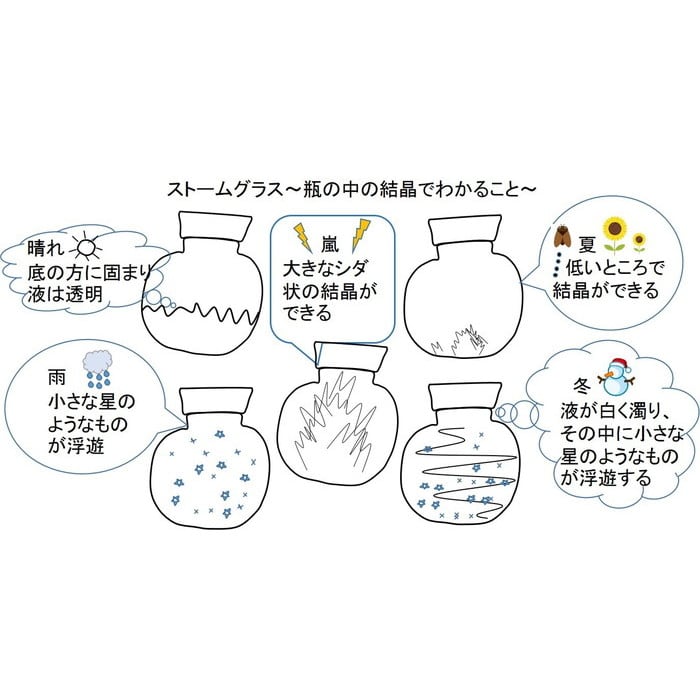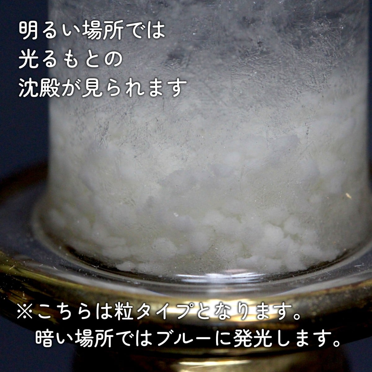 暗闇で光る! 「光るクレオパトラストームグラス 棒状 ドロップ」 夜光 プレゼント 贈り物 誕生日プレゼント 女性 ストームグラス ウェザーグラス 天気 気象計グッズ 手作り ハンドメイド インテリア雑貨 おもしろグッズ おもしろ雑貨 暗闇で光る!気象状況によって結晶が変化するストームグラス 世界に一つとして同じものはない完全オリジナル!明るい場所では、日々変化する結晶の観察を..。暗い場所では、ほんのりと優しく光ります。明るい場所でも暗い場所でも、お楽しみ頂く事ができるストームグラスです。※こちらは粒タイプとなります。暗い場所ではブルーに発光します。高さ:約10cm中世のヨーロッパの航海士たちがこのビンの結晶をみて天気を予想し、航海に役立てたと言われています。冬の雪や霜のときには、管の高い位置まで沈殿物が見え、とても白く、点状になります。夏のとても天気がよい日には沈殿物は管の非常に低い位置までしかできません。結晶はごくゆっくりと変化します。年単位でお楽しみ下さい。注意事項○明るい場所では光るもとの沈殿が見られます○環境によって、結晶が変化しますので、写真のような状態が保たれるわけではございません。夏の暑い日には一時的に透明になりますが、再び結晶は現れます。無くなることはありません。○加熱や急冷(電子レンジ)はご遠慮ください○内用液にはアルコールや硝酸カリウム、塩化アンモニウムなどが入っております。火器の近くに置かないでください。小児の手の届かないところに保管し、誤飲しないようにお願い致します。※クレオパトラストームグラスはカイセイ加工有限会社の登録商標です。模倣品の販売は固くお断りいたします。 2