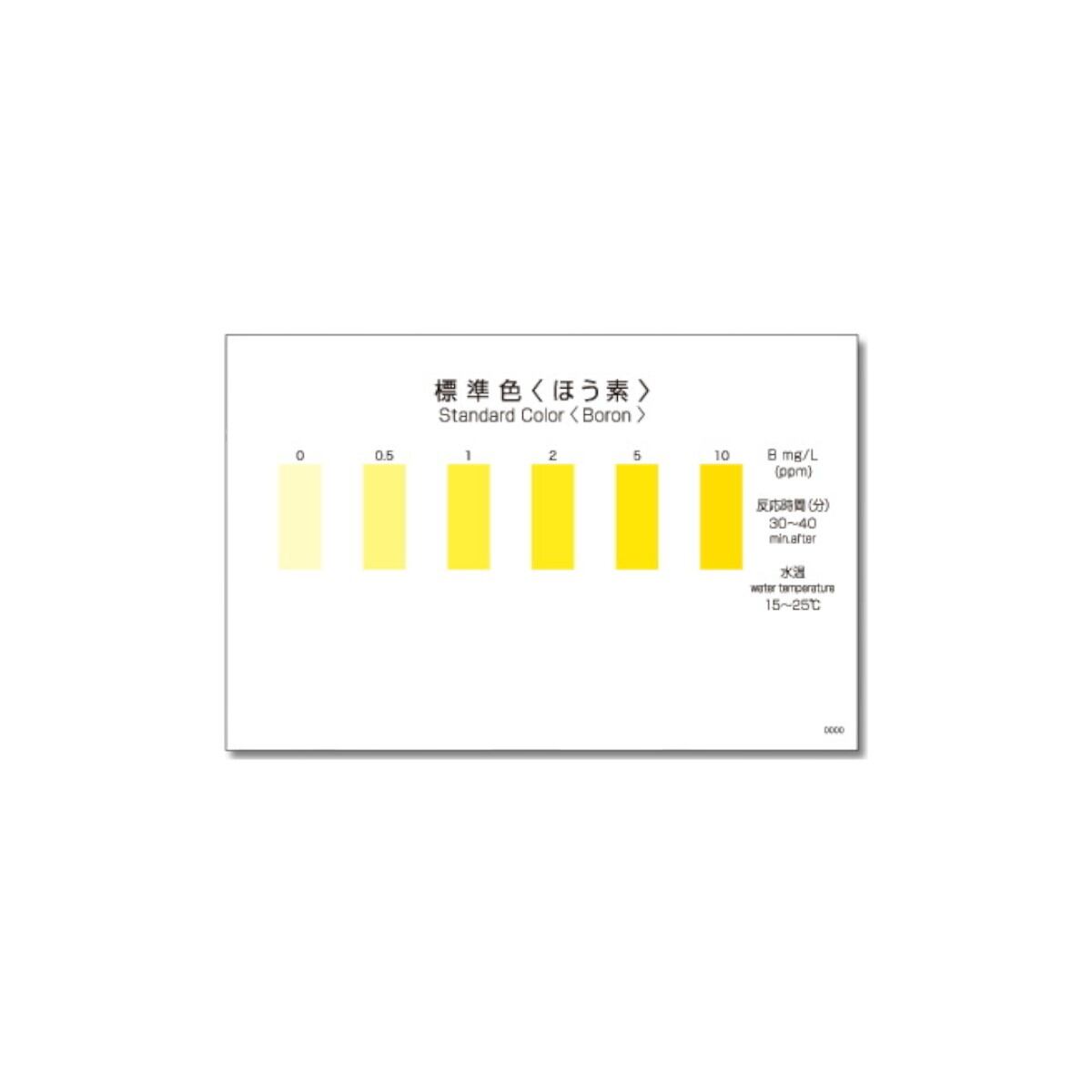 この製品は、工場排水をはじめ、いろいろな検水中のほう砂(四ほう酸ナトリウム)やほう酸の状態のほう素を簡単な操作で短時間に測定することができます。